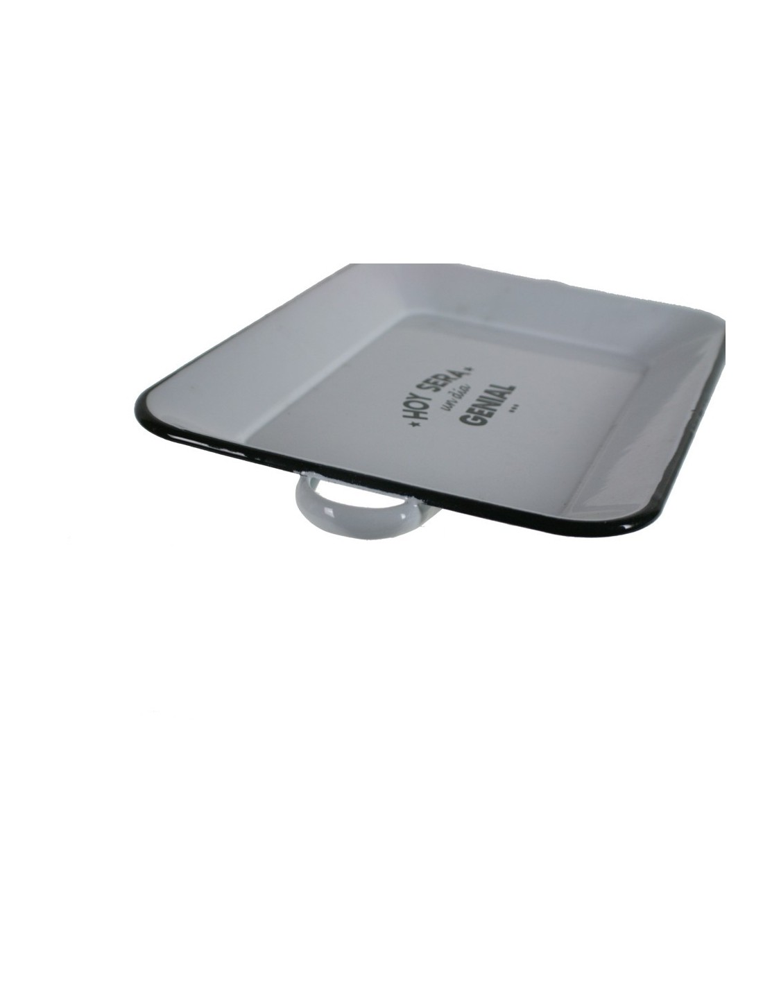 Safata esmaltada blanca amb l'encantadora frase “Avui serà un dia Genial”, estil vintage. Lleugera i resistent, perfecta per portar vaixella, cafè i te de la cuina a taula.