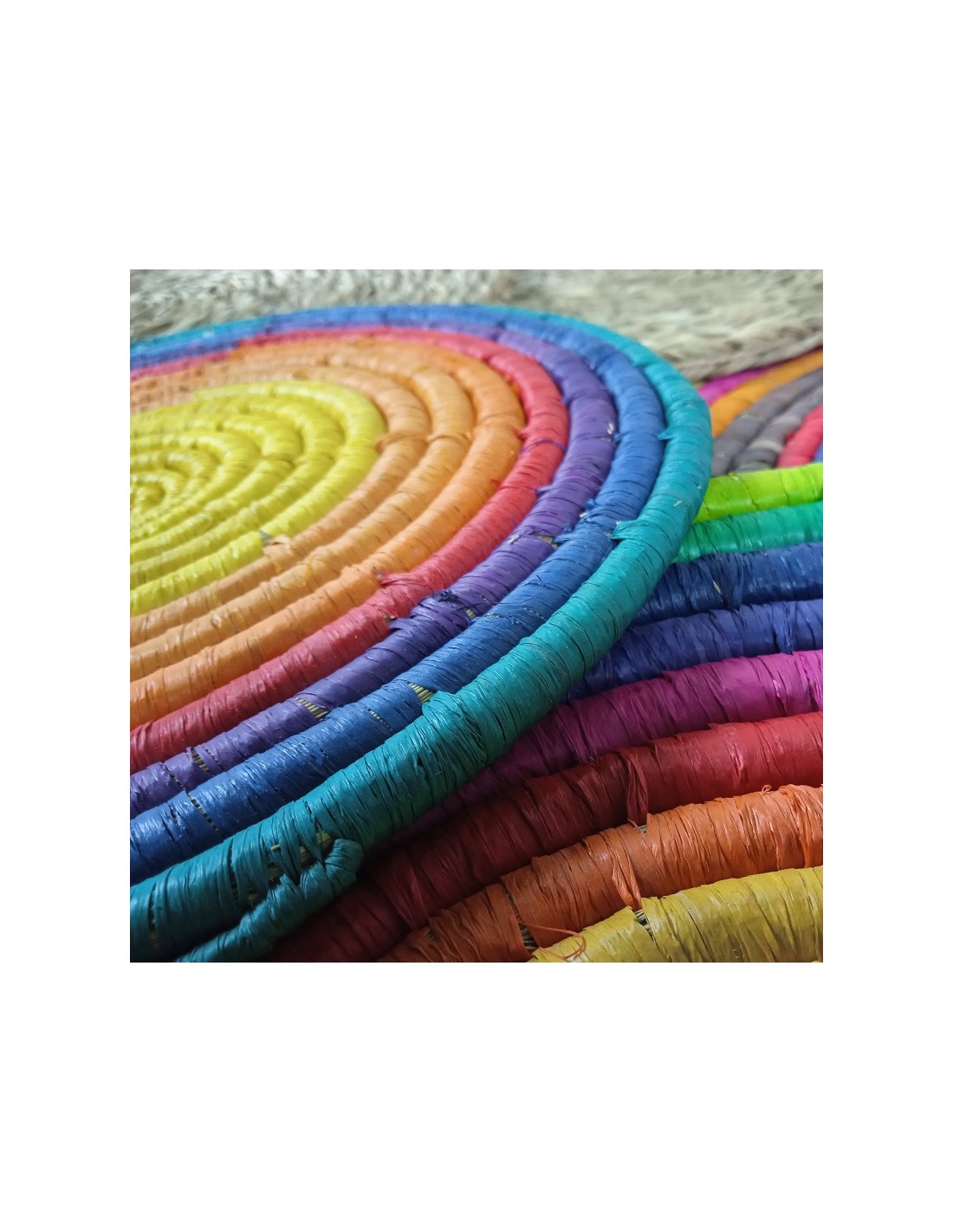Salvamantel Artesanal Baix Plat de Fibra Multicolor per a aïllament tèrmic, parament de taula. Mides: Ø 30 cm.