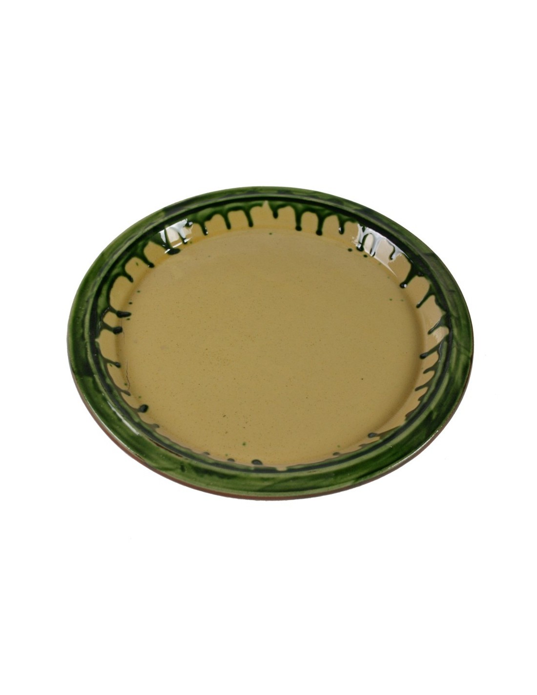 Safata d'argila rodona, de color groc decorada, parament de taula, tradició artesanal. Mides: 3xØ30 cm.