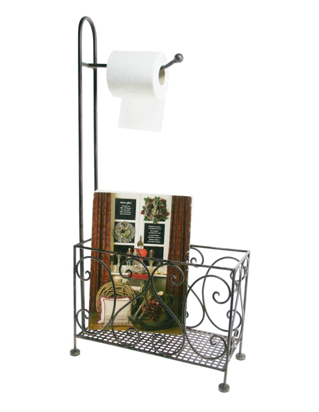 Doneu-li un toc d'estil i funcionalitat al vostre bany amb aquest original porta-rotllos de paper higiènic amb cistella per a revistes. Fabricat amb ferro forjat, combina elegància i practicitat en un sol article.