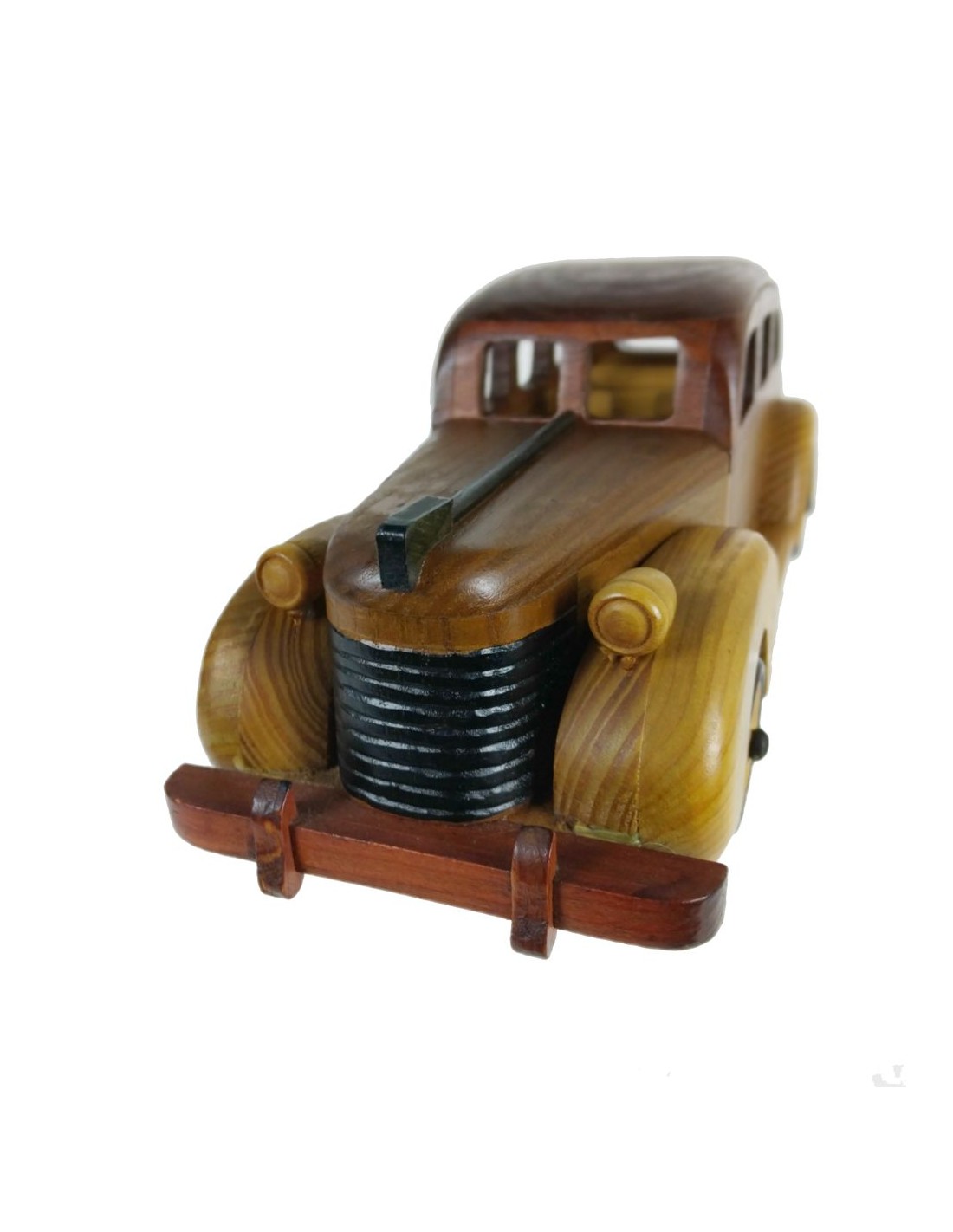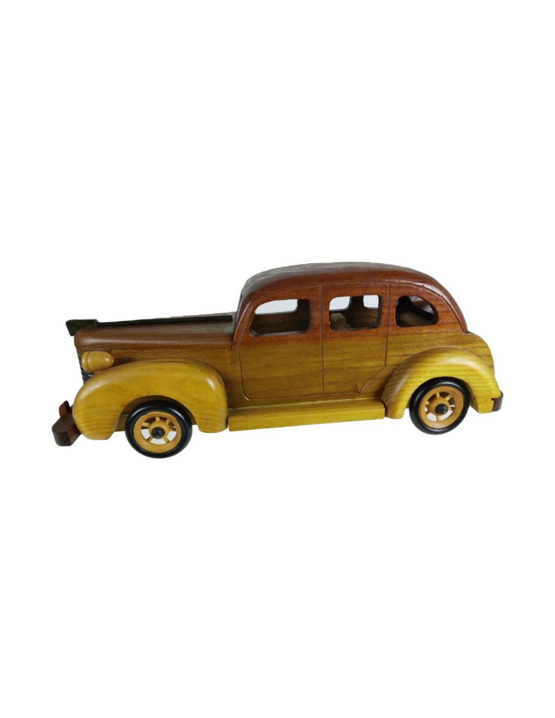 Aquest cotxe clàssic de fusta, elaborat artesanalment, captura l'essència de l'elegància d'antany. El seu acabat polit i el contrast natural de tons a la fusta destaquen el treball minuciós de l'artesà. Ideal per a col·leccionistes, amants del retro o com a peça decorativa en qualsevol estada.