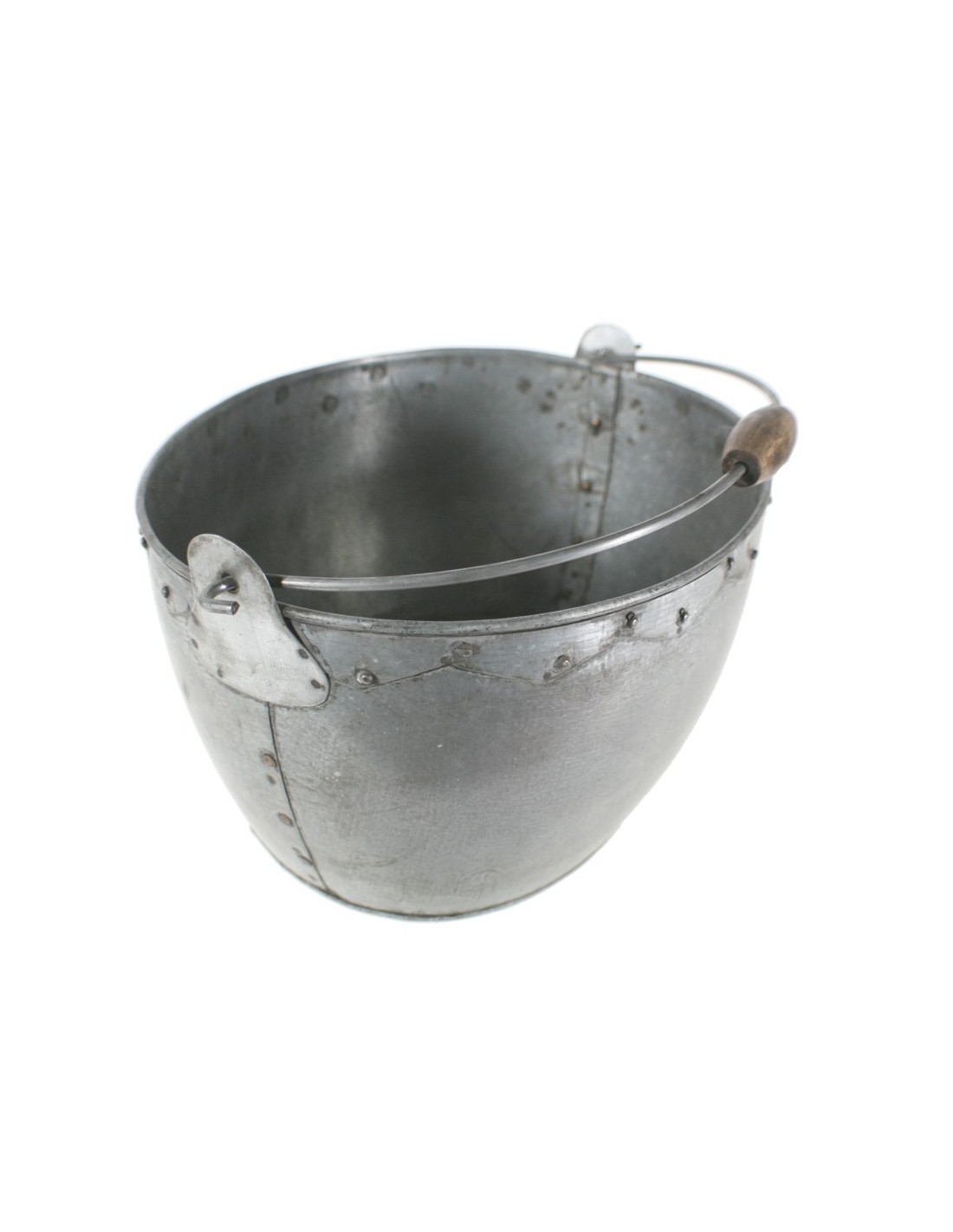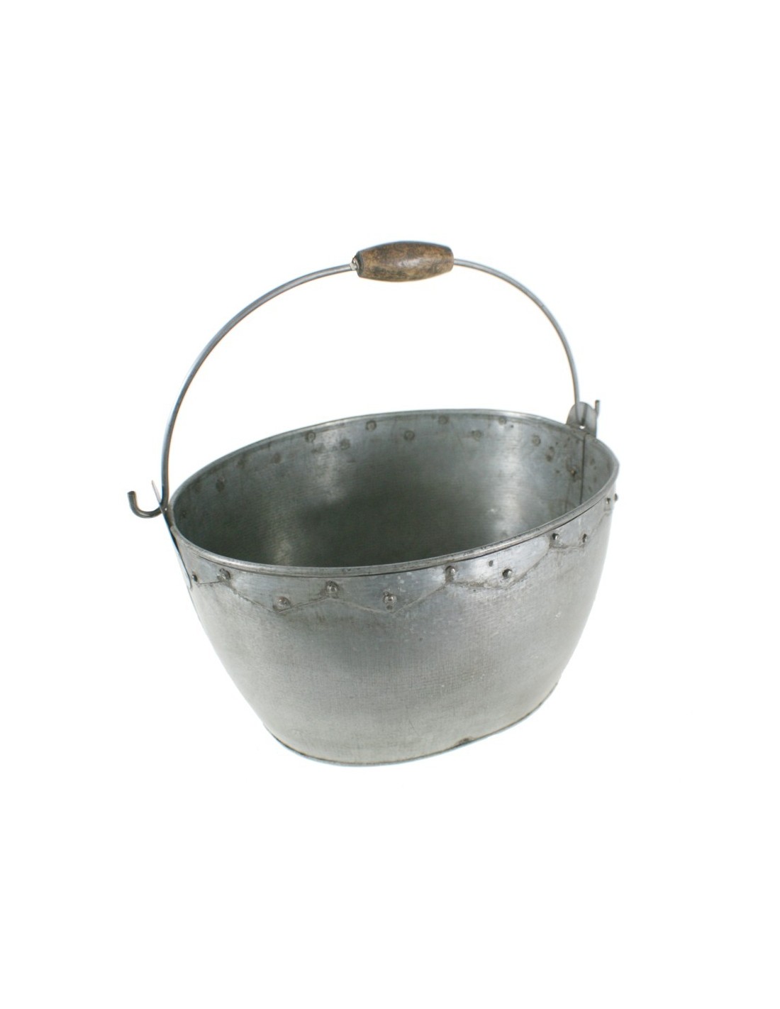 Calder de metall color estany ansa de fusta i amb reblons. Mesures: 20x36x30 cm.