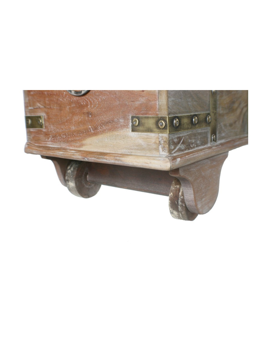 Aquest impressionant bagul de fusta massissa decapada està dissenyat per aportar tant la funcionalitat com l'estil. Les seves ferramentes metàl·liques amb reblons, rodes incloses i acabat bicolor li donen un aire vintage i robust que encaixa en múltiples estils decoratius.