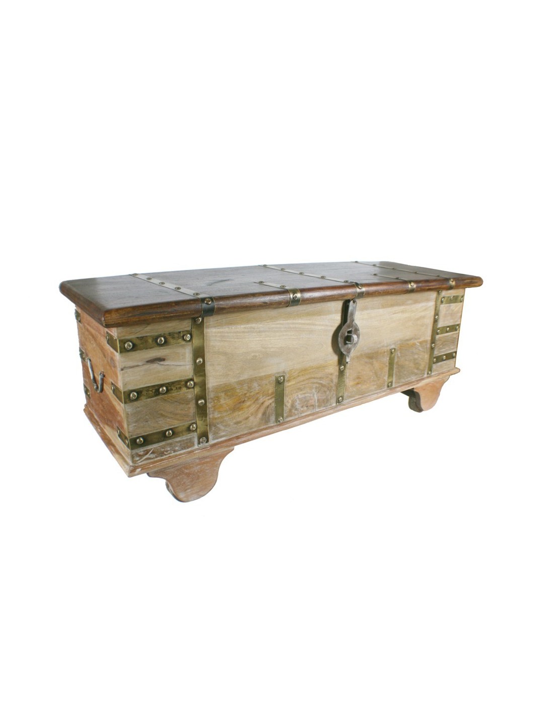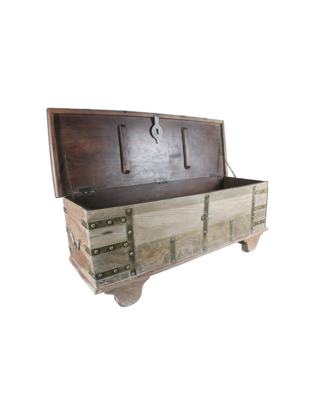 Bagul gran de fusta massissa decapada amb rodes, ferratges metàl·lics i gran capacitat d'emmagatzematge. Perfecte per separar sofàs o col·locar al peu de llit.
