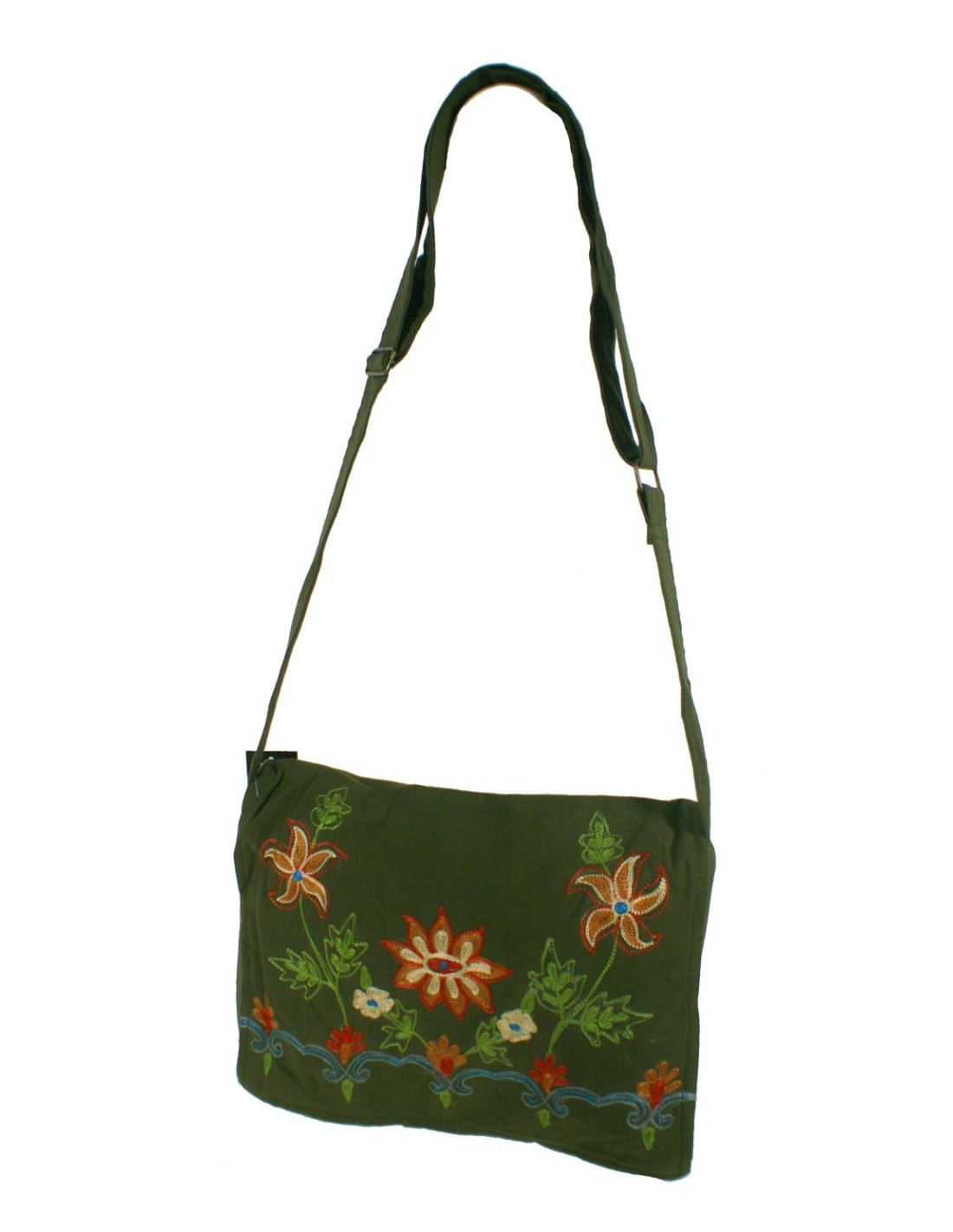 Bossa multiús ètnic brodat hippie amb solapa i nanses de teixit cotó color verd. Mesures: 29x35 cm. Aprox.