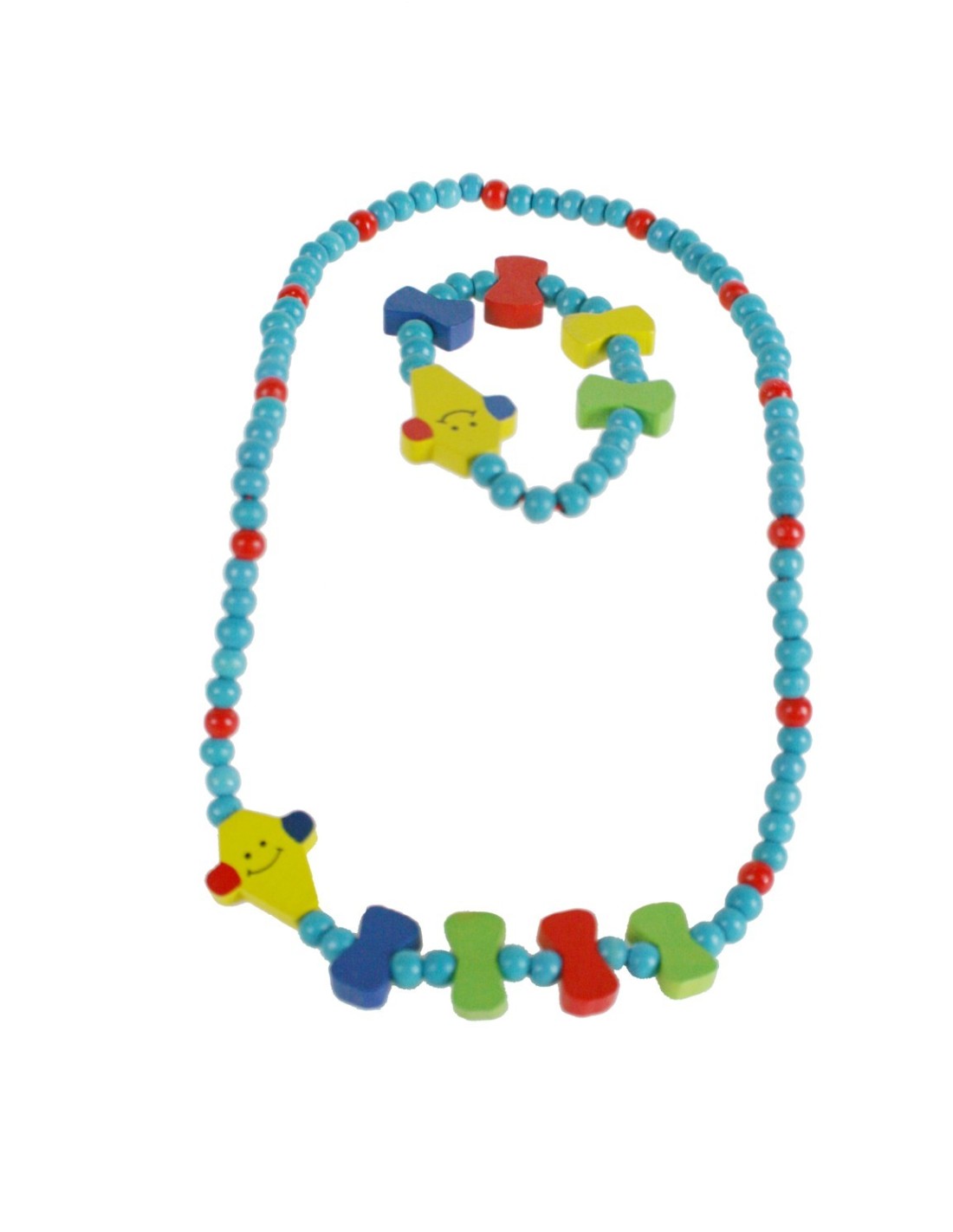 Per a les princeses més petites de la casa. Un bonic collaret a joc amb la pols, de fusta de color blau turquesa amb detall de pallasso. Amb goma elàstica.Mesures: Llarg collaret 23 cm. Polsera Ø5 cm.
