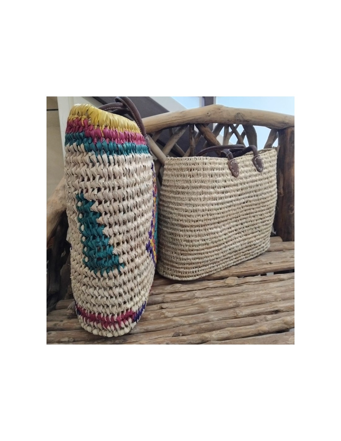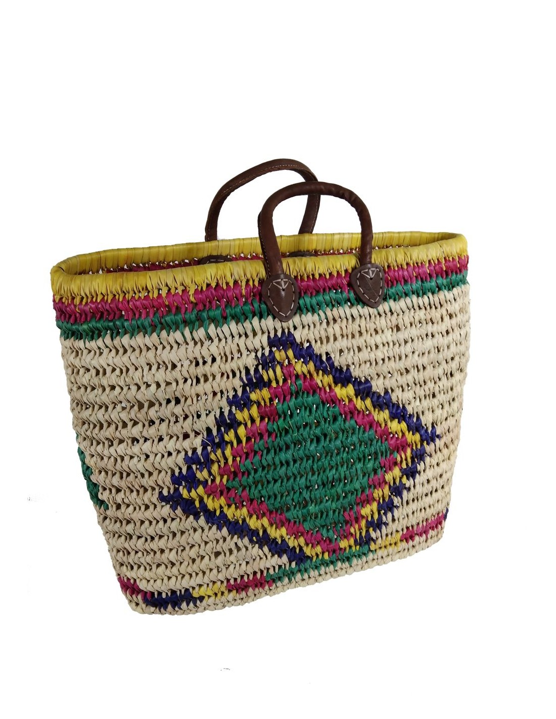 Cistella de palmell natural teixida a mà, amb nanses de cuir i disseny colorit. Ideal per a la compra, la platja o per regalar. Artesania nacional amb molt d'estil.