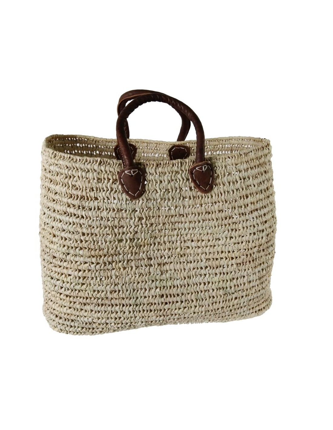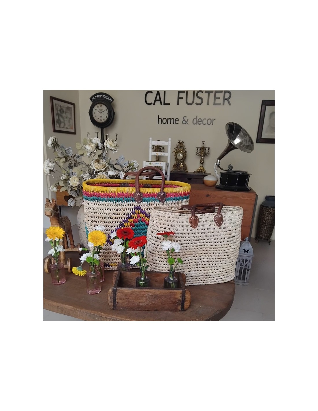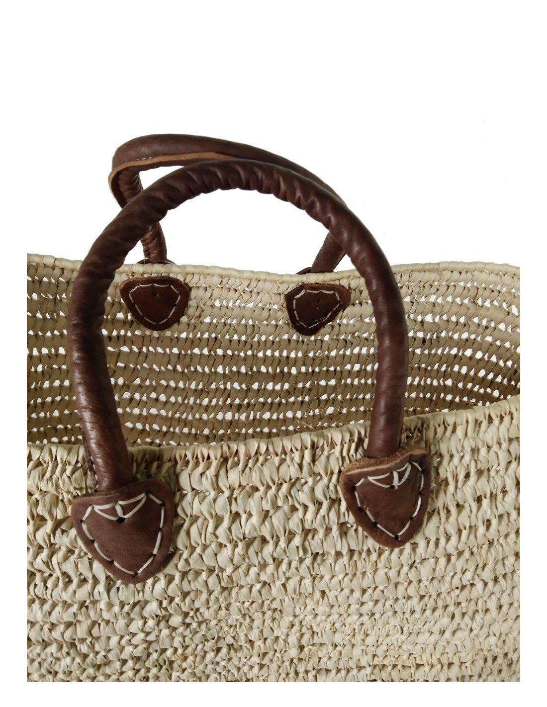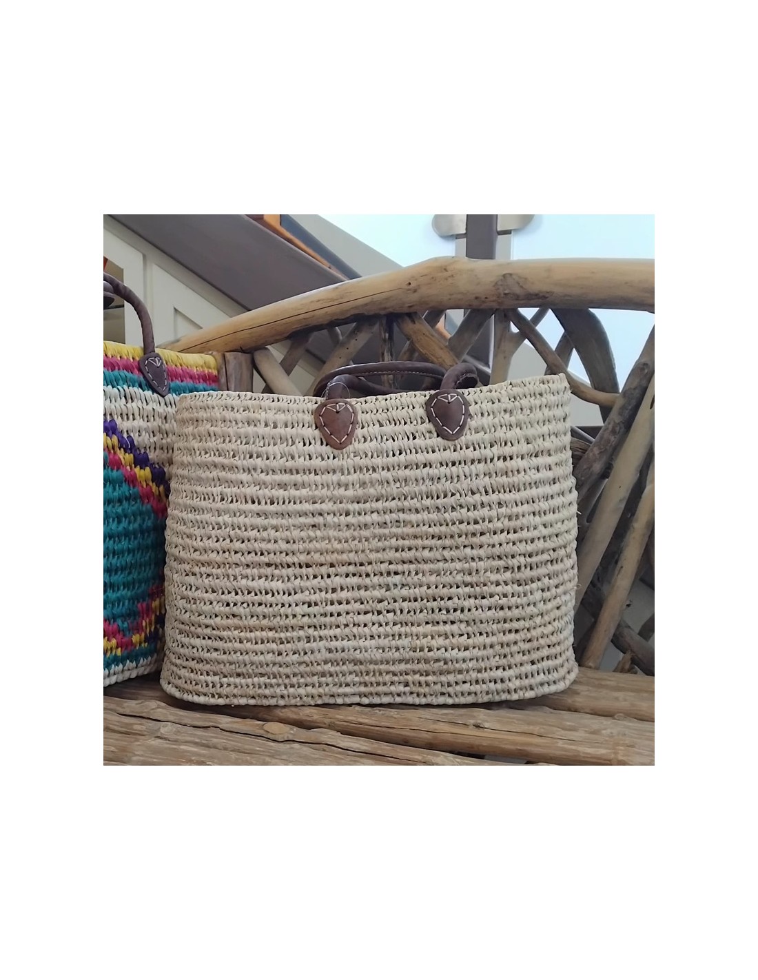 Una cistella gran, teixida a mà al palmell natural, amb nanses de cuir. Ideal per a la compra, la platja o com a regal funcional i amb estil.