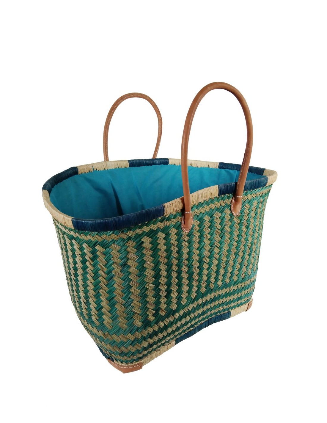 Cistella de la Compra amb nanses de cuir amb Folre, Cabàs Artesanal de Ràfia Color Verd i Blau. Mides: 35x57 cm.