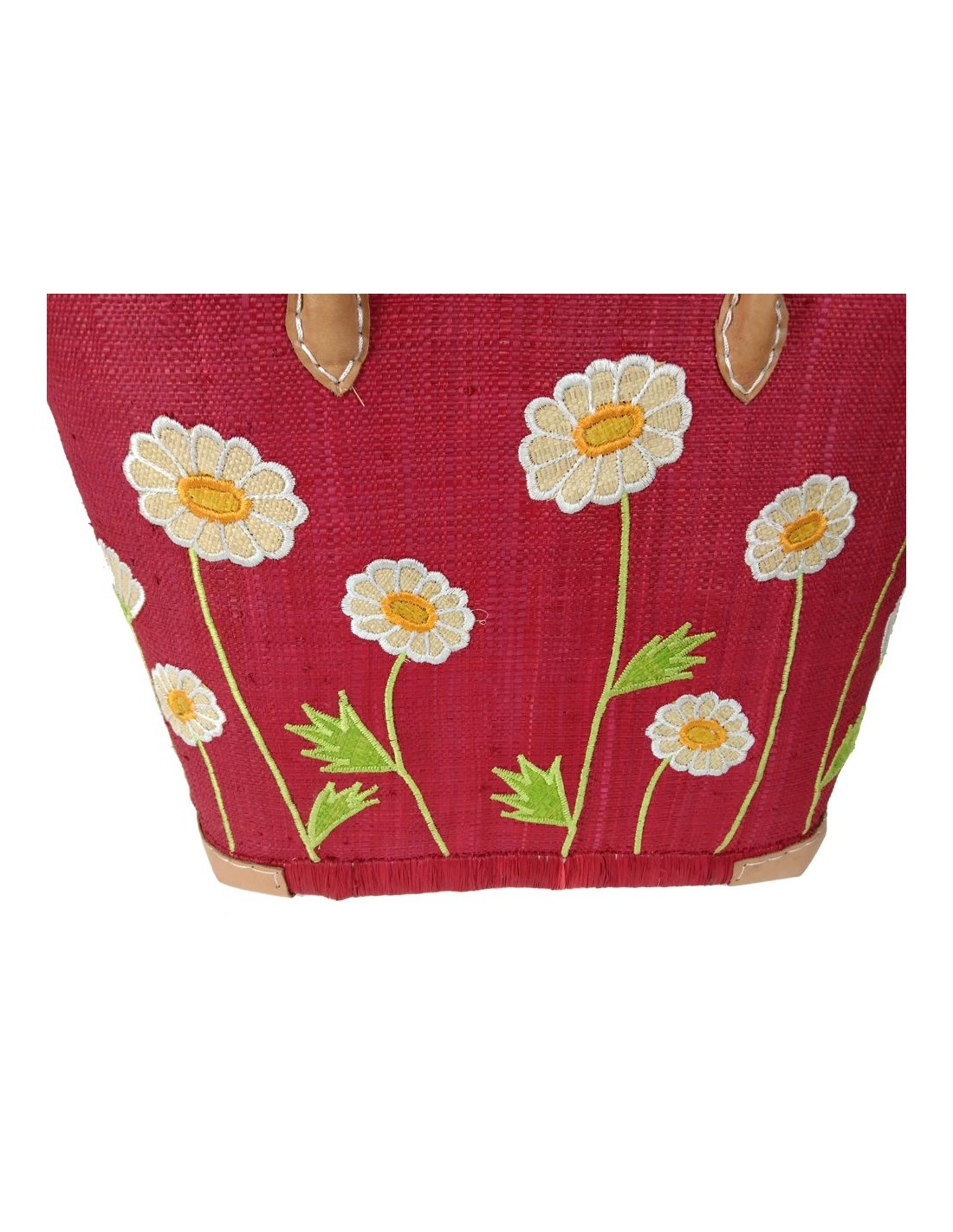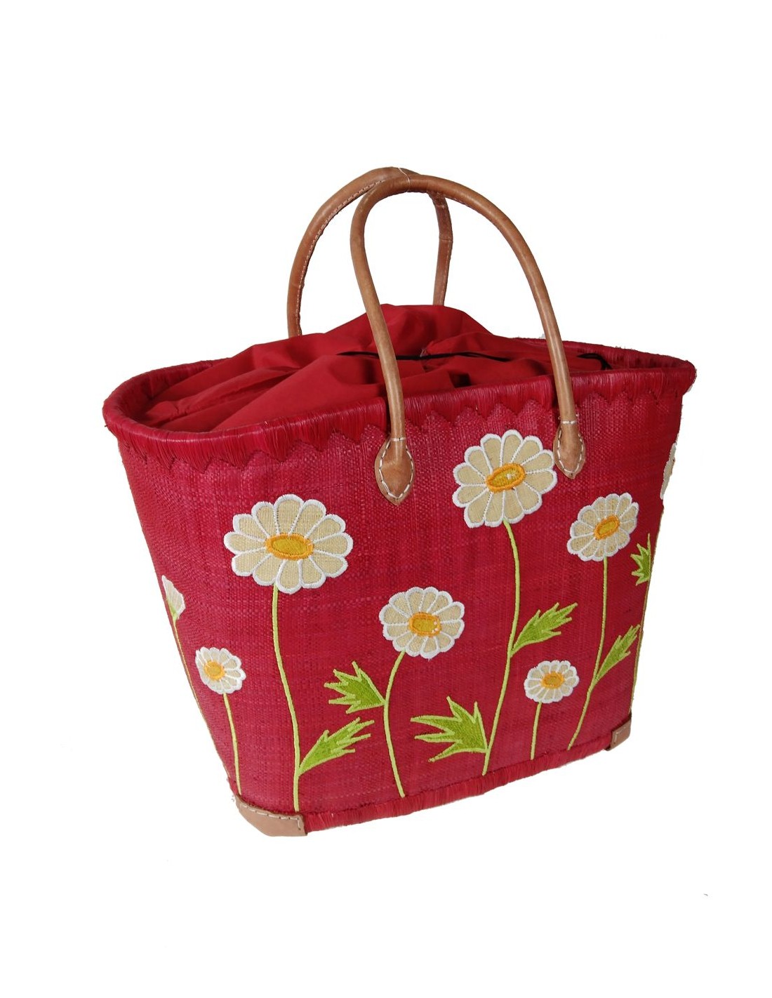 Cistella de compra de ràfia de color vermell amb detall floral, nansa de cuir,tancament amb cordó. Mides:39x48x33 cm.