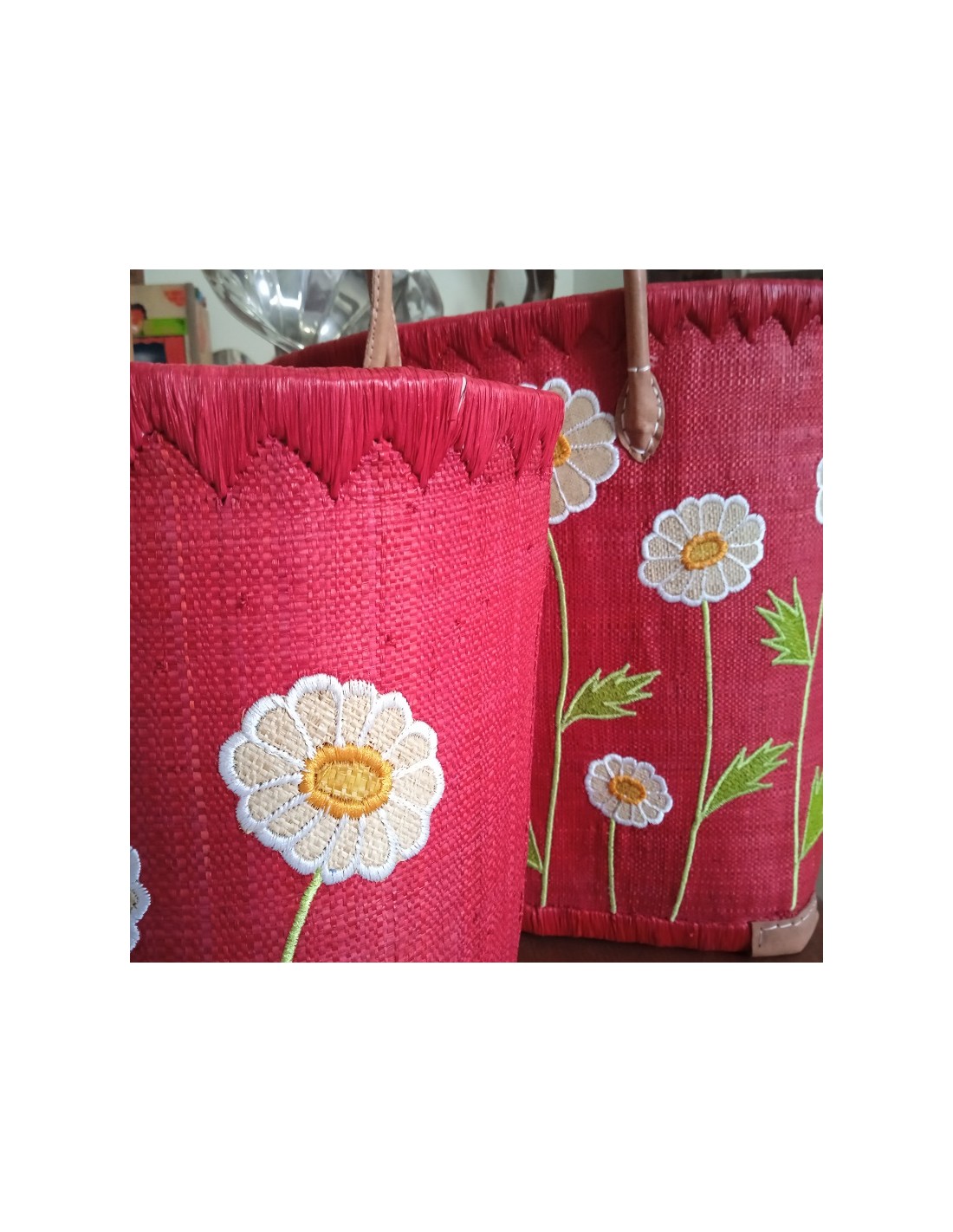 Aquesta cistella de compra combina estil, utilitat i comoditat amb nanses de cuir, el color vermell que aporta sofisticació. Un encantador detall floral adorna la part davantera, afegint-hi bellesa. Mantingues les teves pertinences segures i protegides amb el tancament interior de cordó. Fabricació en ràfia natural i ampli espai, és una elecció ecològica i versàtil per a compres i passejades. Amb la seva grandària gran, aquesta cistella us ofereix molt espai per a les vostres compres, la platja o qualsevol ocasió.