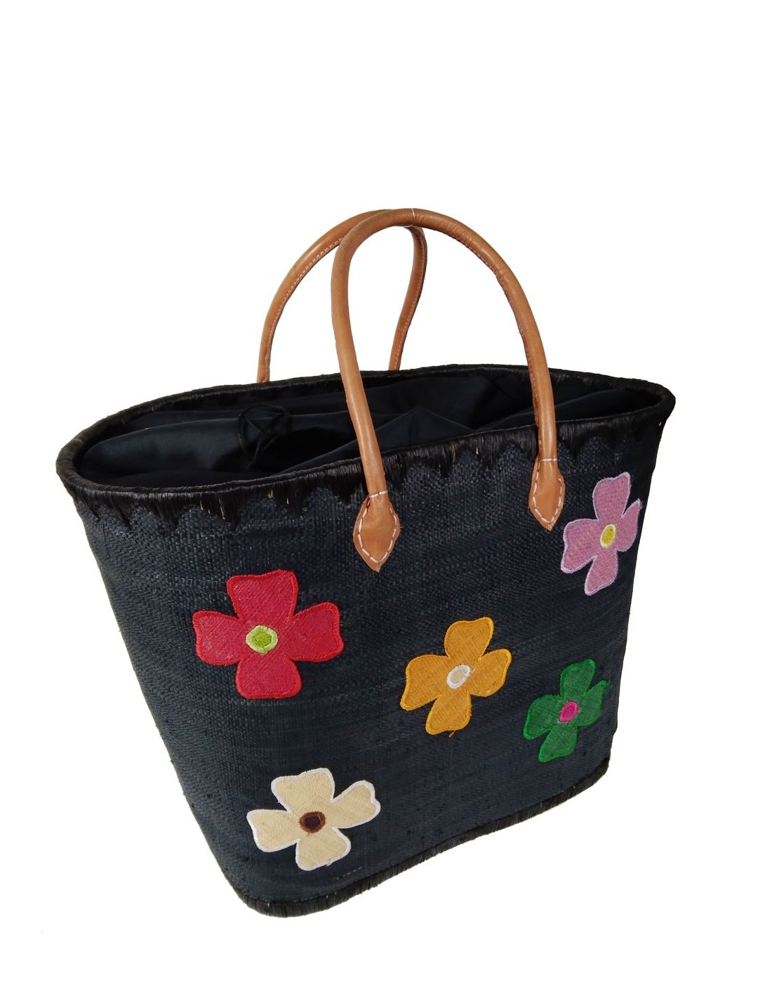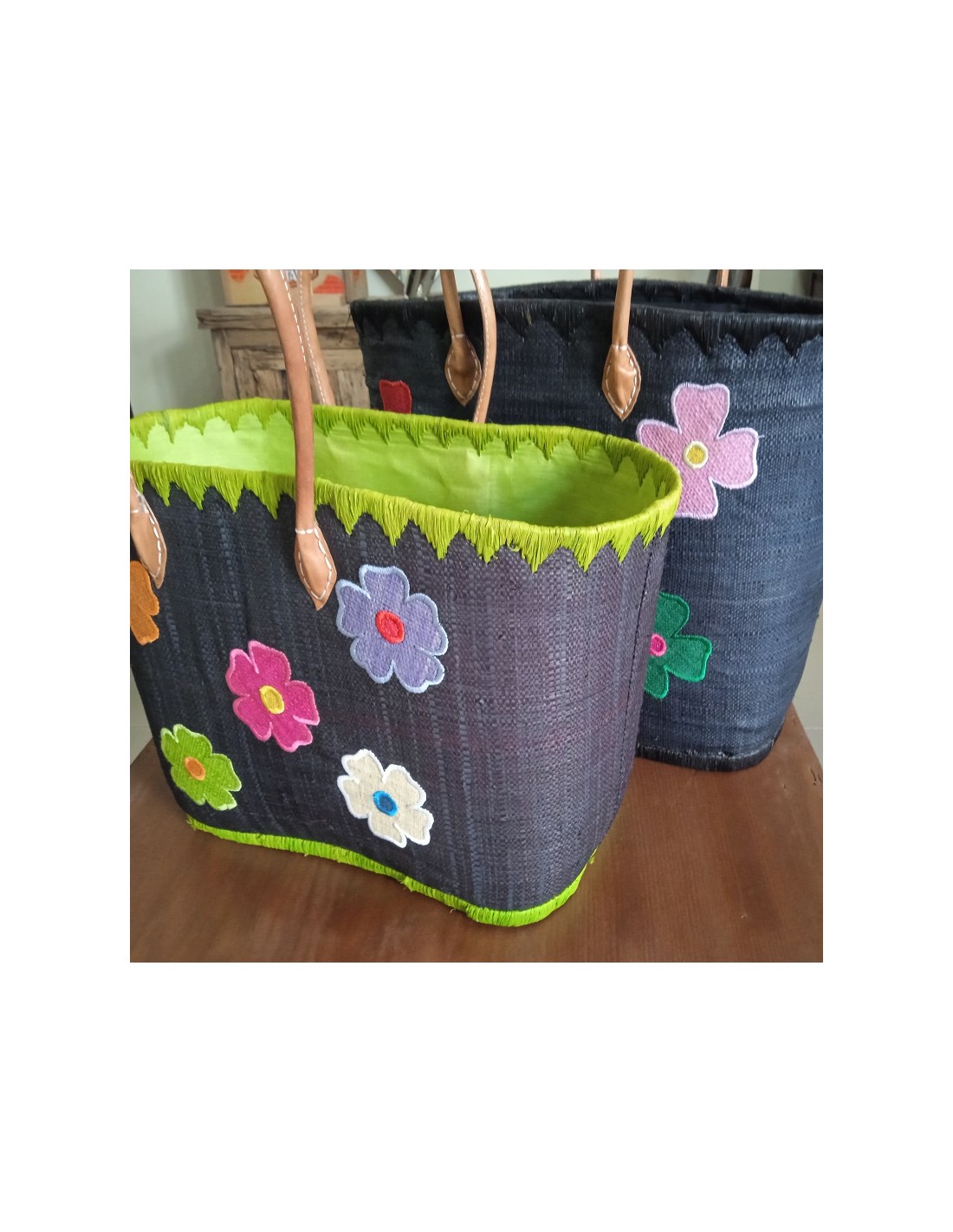 Cistella de Compra de Ràfia de color Negre amb detall floral i nansa de cuir, tancament amb cordó. Mides: 38x48x30 cm.