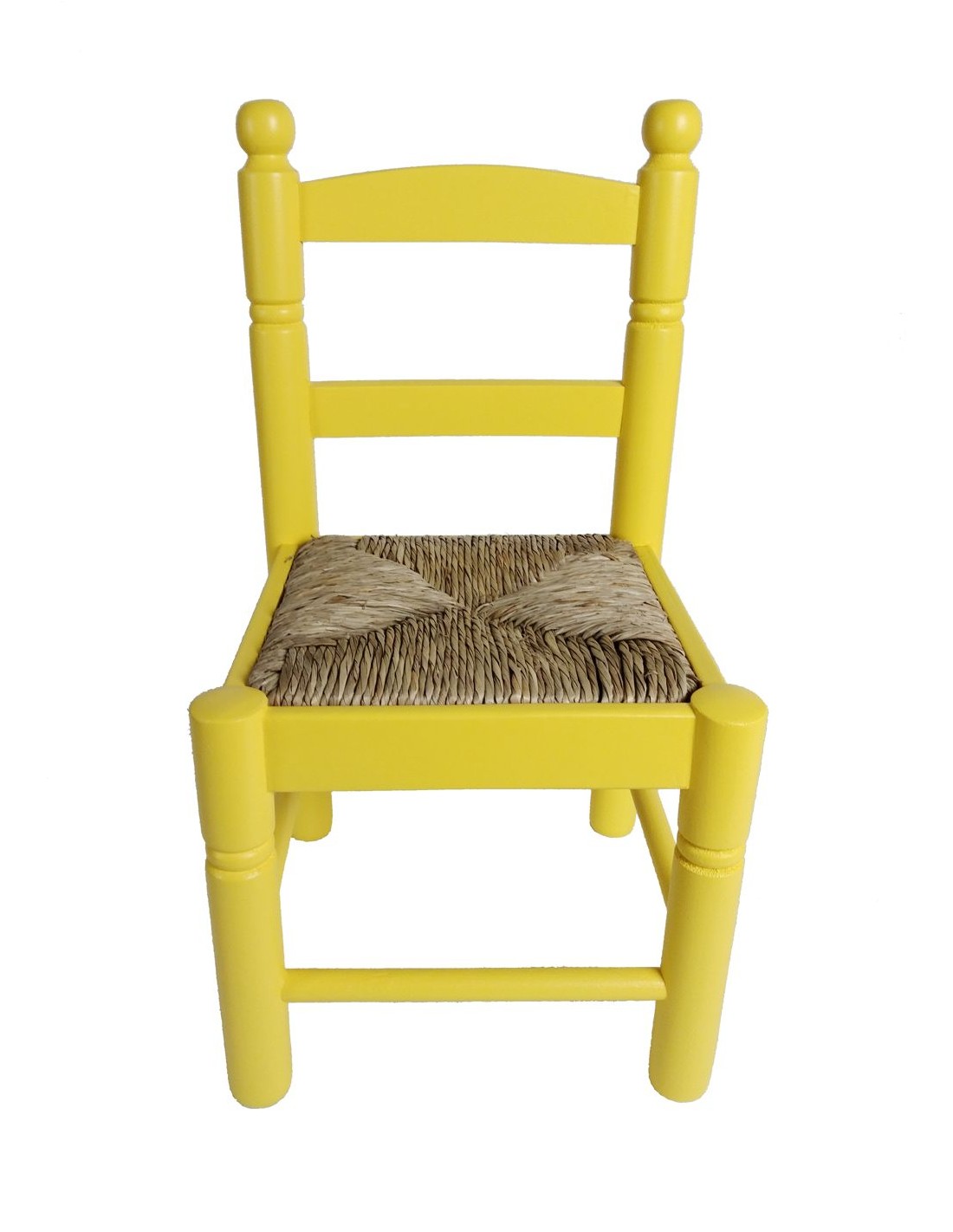 Cadira infantil de fusta massissa de pi pintada a mà de color groc, amb seient tradicional d'ania. Perfecta perquè els més petits pintin, llegeixin o juguin. Fabricada de manera artesanal amb pintura a l'aigua.