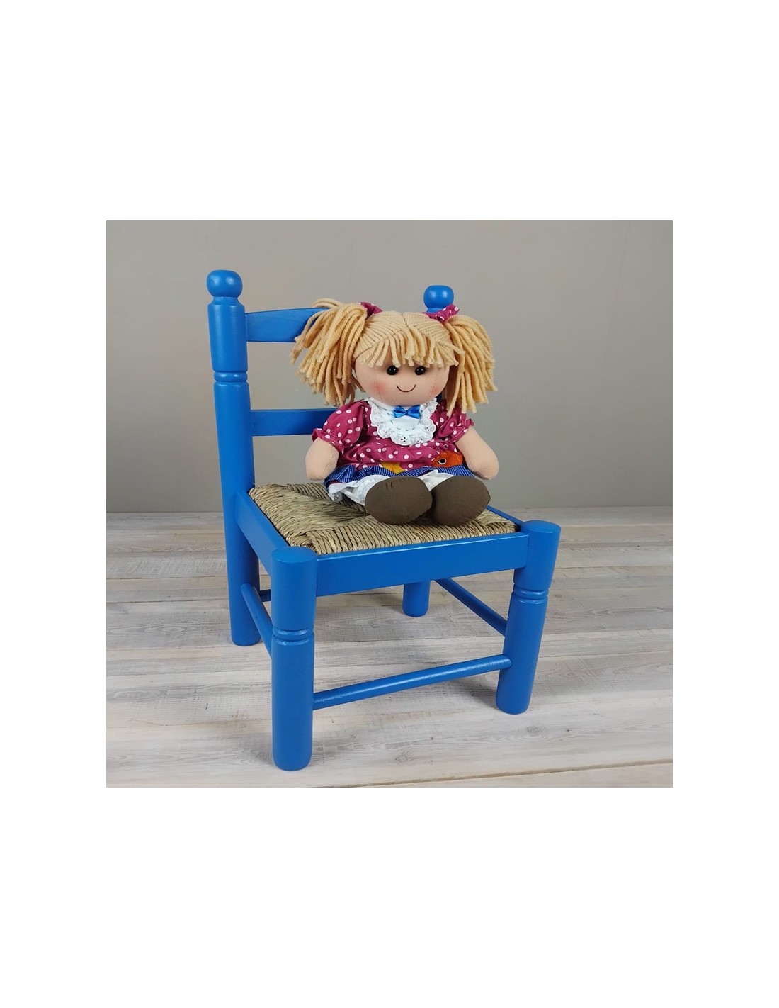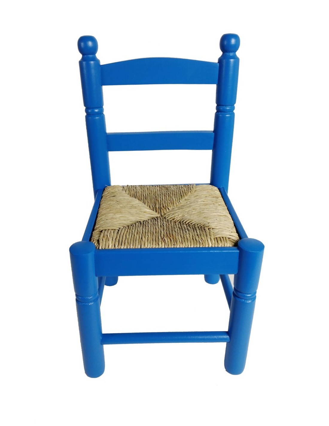 Cadira infantil de fusta massissa de pi pintada a mà de color blau, amb seient tradicional d'ania. Perfecta perquè els més petits pintin, llegeixin o juguin. Fabricada de manera artesanal amb pintura a l'aigua.