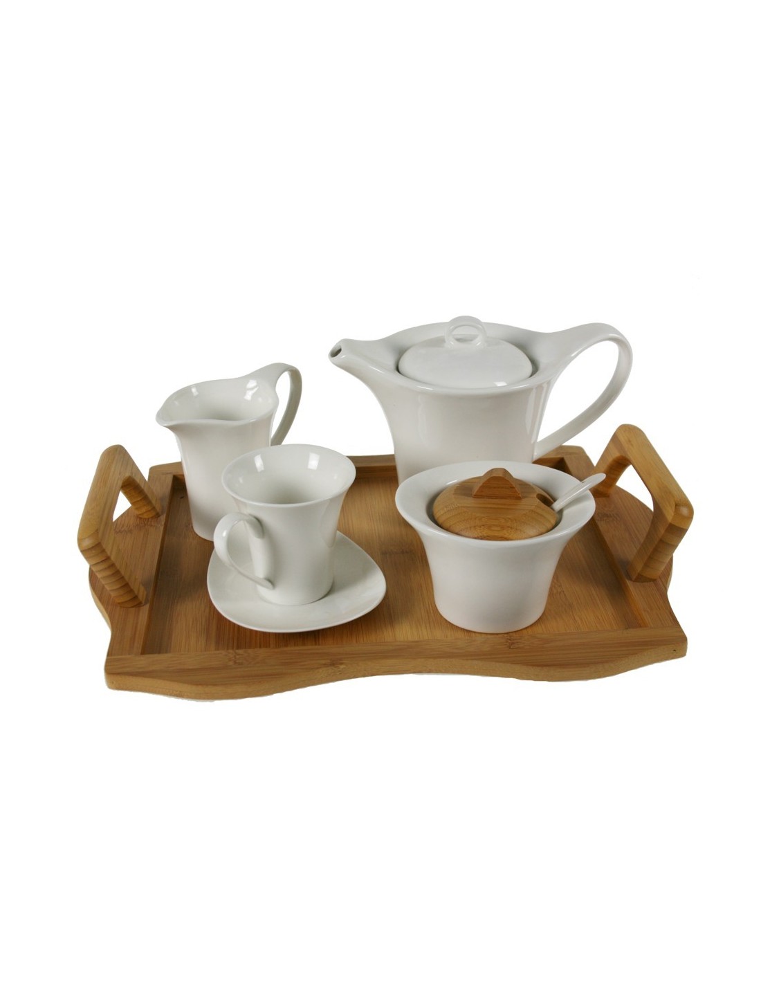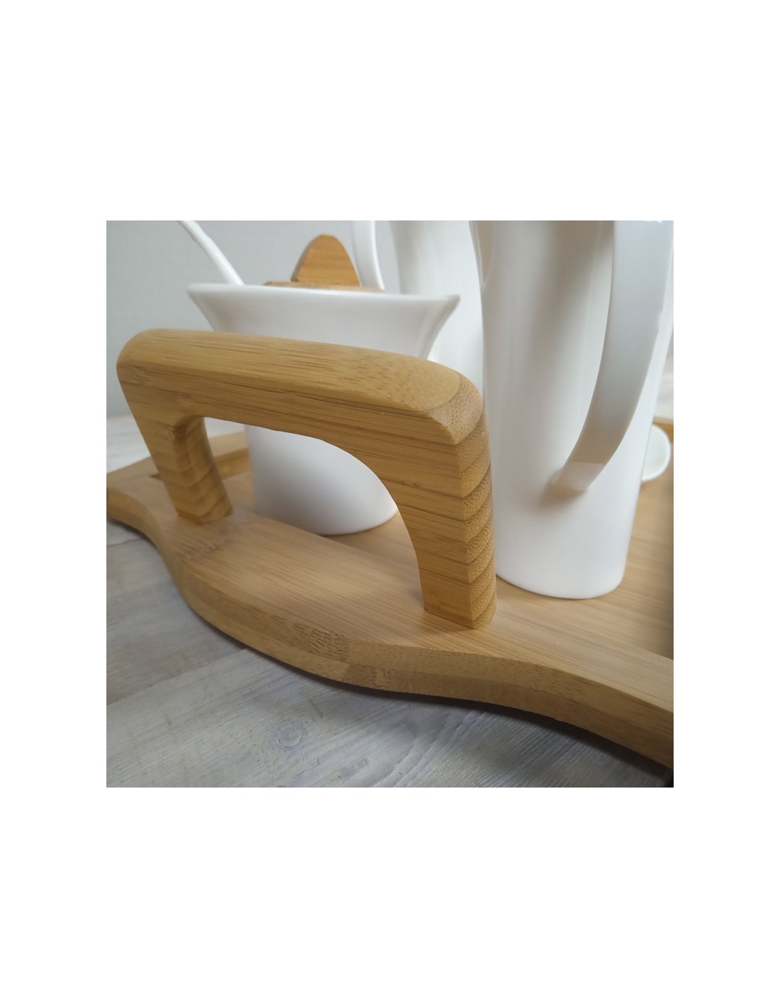 Gaudeix d´un cafè amb estil amb aquest preciós joc de 12 peces en ceràmica blanca, acompanyat d´una safata de fusta de bambú. Una combinació perfecta que aporta calidesa i elegància als teus moments especials.