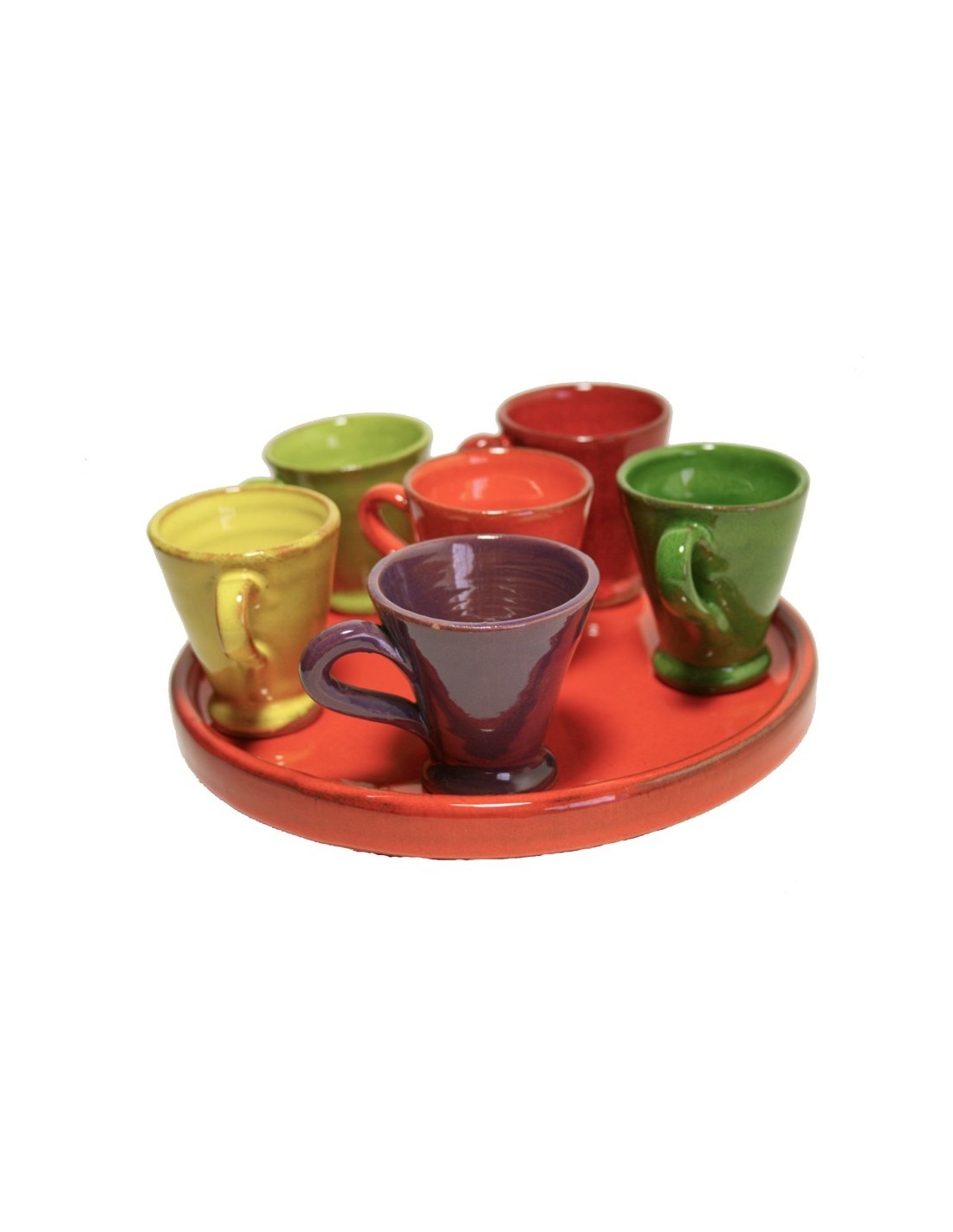 Gaudeix de l'encant de la ceràmica artesanal amb aquest joc de sis tasses de cafè exprés en colors variats, acompanyades d´una safata per servir. Un parament de cuina rústic i autèntic, fet a mà per artesans locals.
