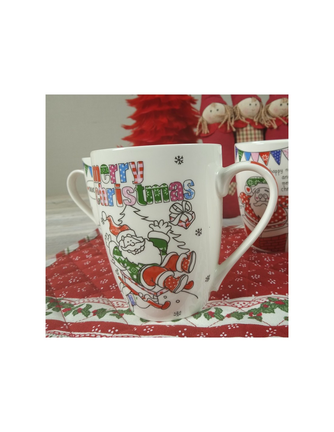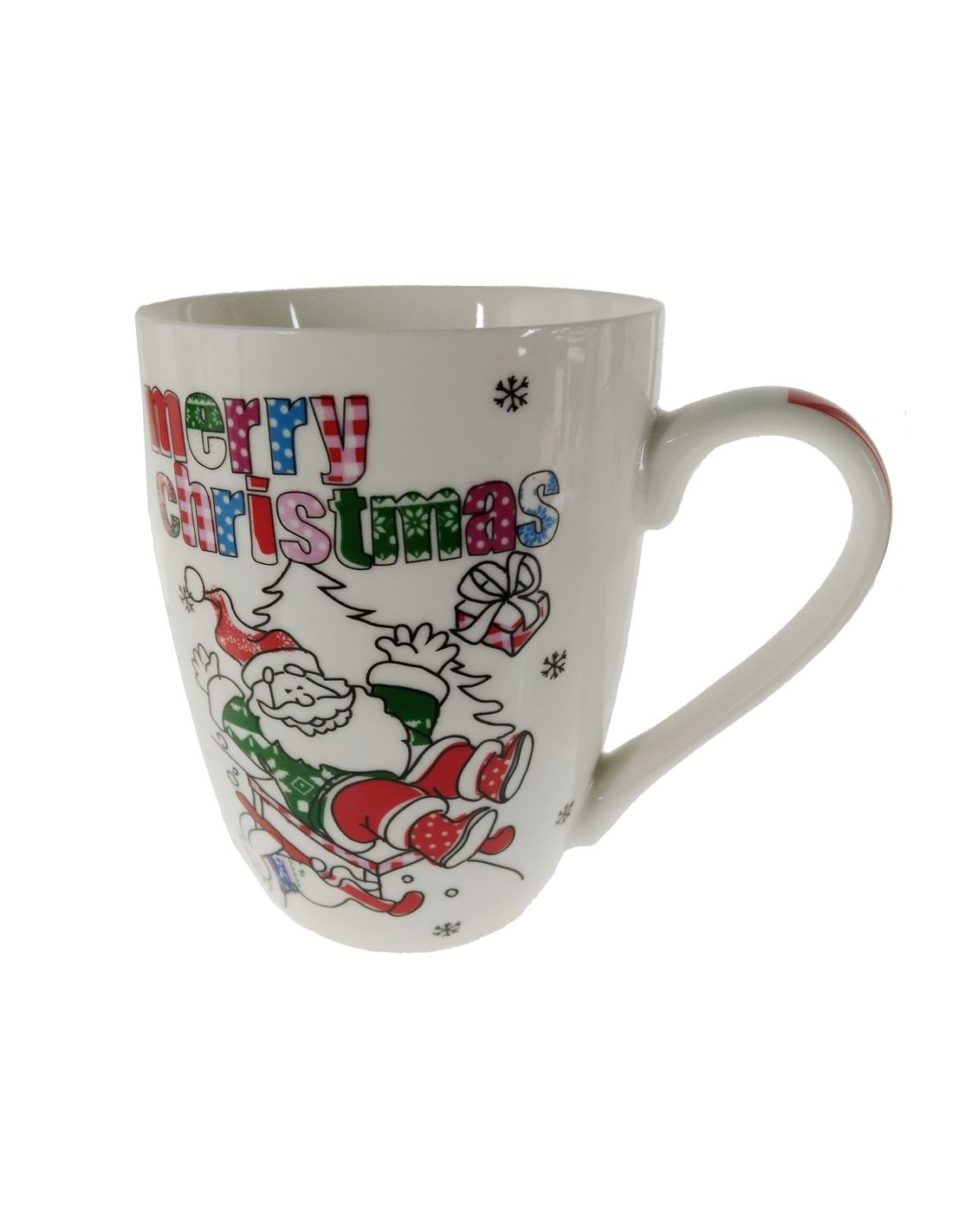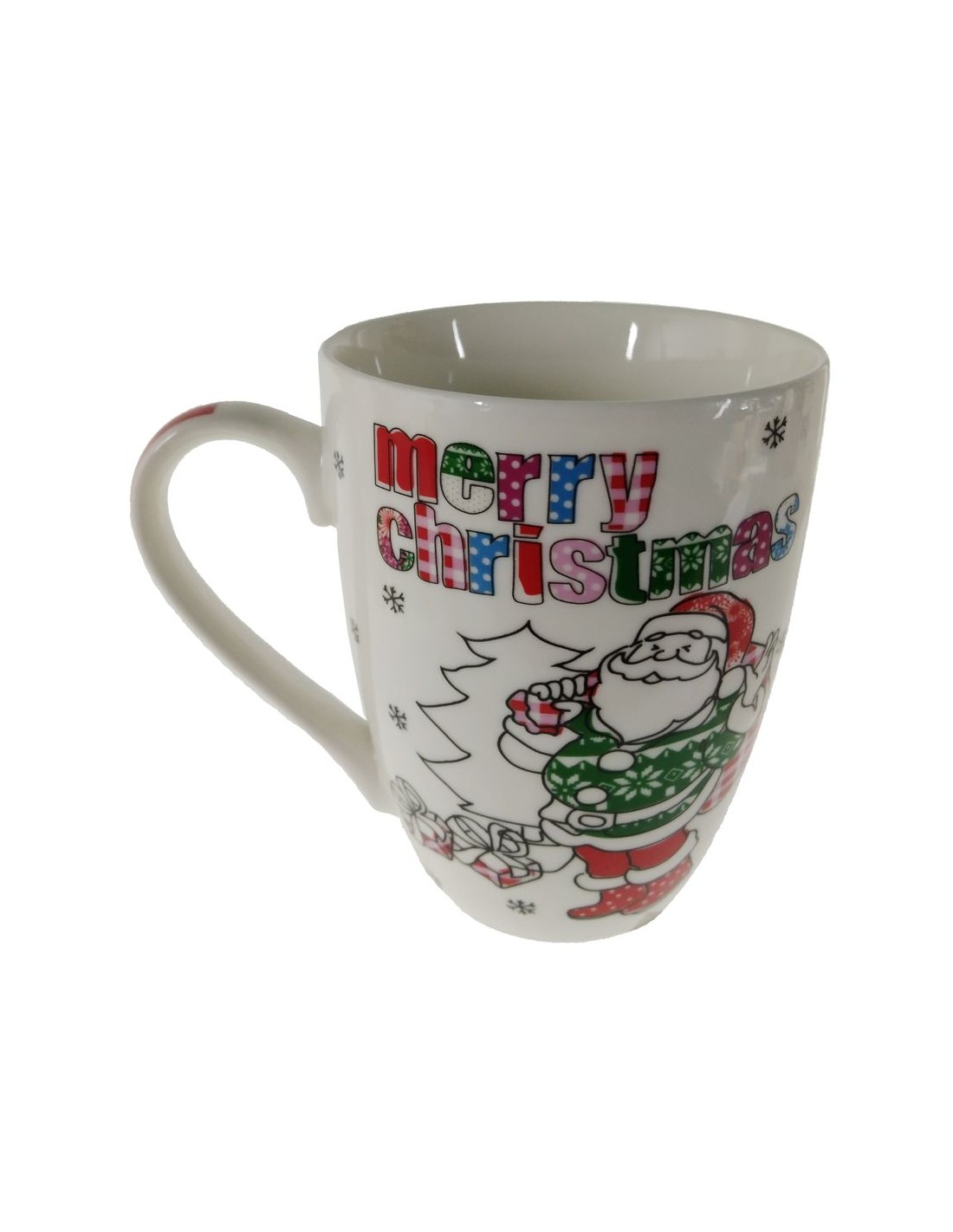 La nostra tassa mug està decorada amb motius típics de Nadal, des del Pare Noel de Nadal fins a flocs de neu, que aporten un toc d'alegria i esperit festiu a cada glop.