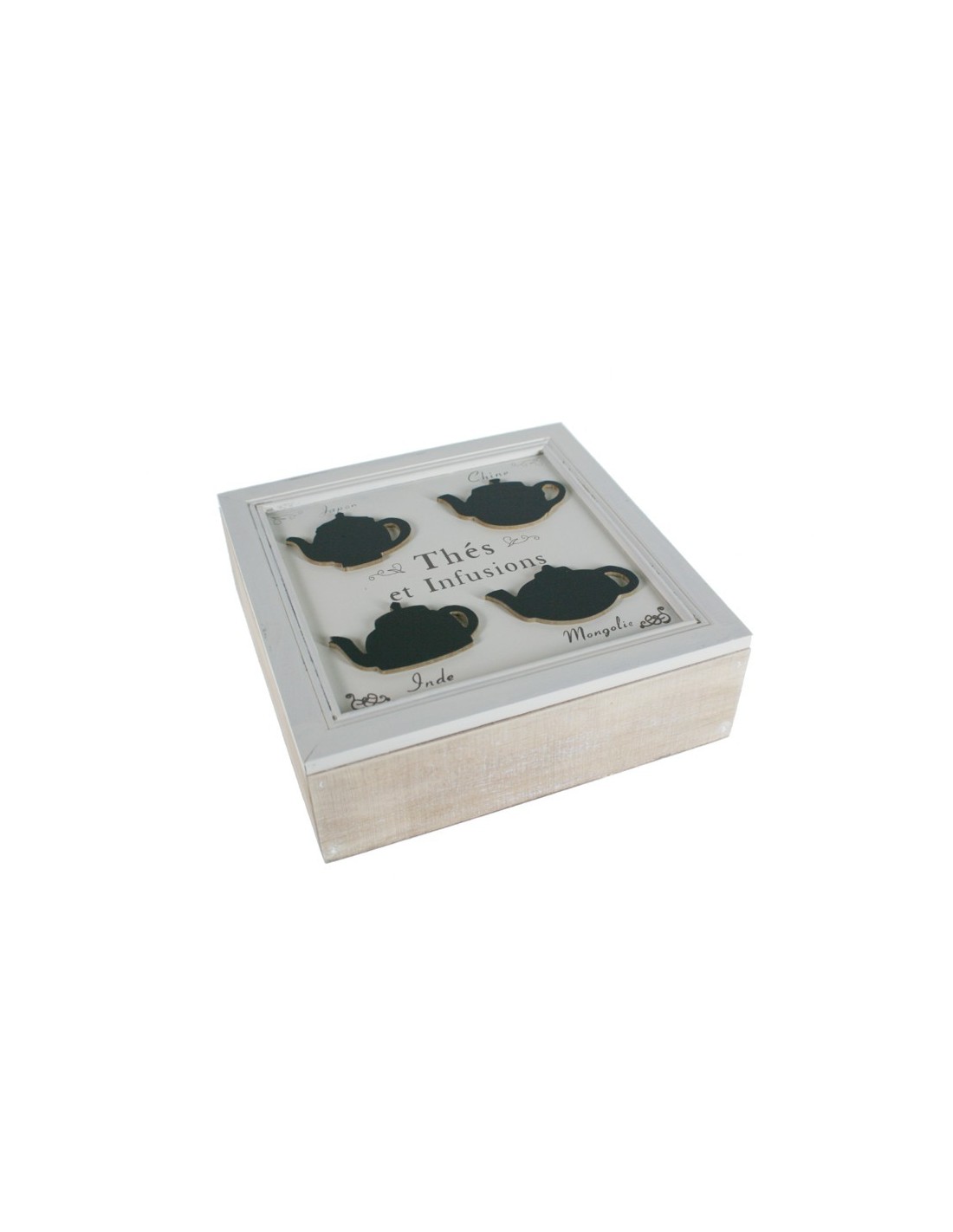 Caixa de fusta massissa amb nou separadors en interior estil vintage. La tapa és de color blanc envellit amb cafeteres típiques del país. Amb els separadors en el seu interior és ideal per organitzar i classificar les bossetes de thé. Una bonica decoració a la teva cuina i segur que sorprendràs als teus convidats.