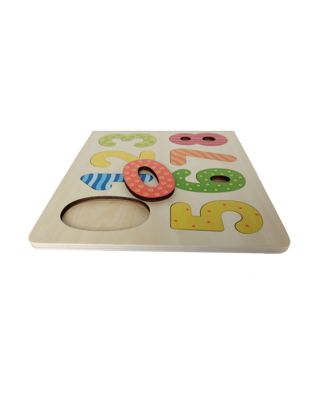 Puzle de fusta perquè els nens aprenguin els números del 0 al 9. Una eina ideal per desenvolupar la concentració, la coordinació ull-mà i aprendre jugant.
