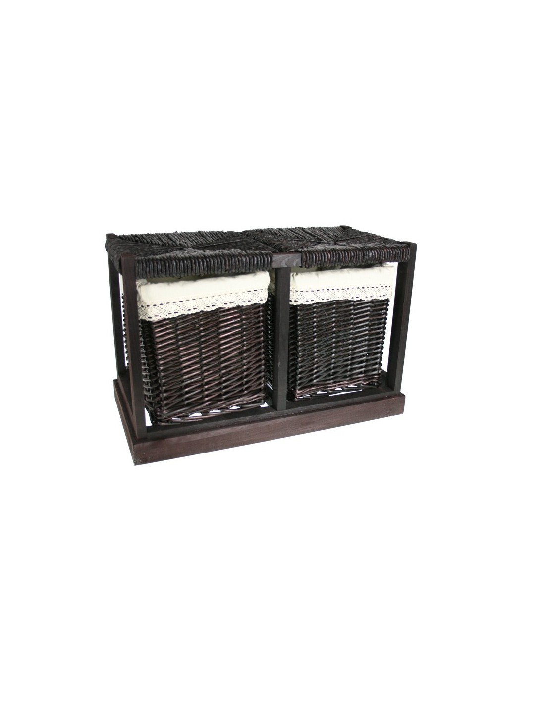 Banc Seient d'Anea Color Noguer, Dues Cistelles de Vímet Forrades per a Emmagatzematge, Decoració Rústic. Mesures:42x62x33 cm.