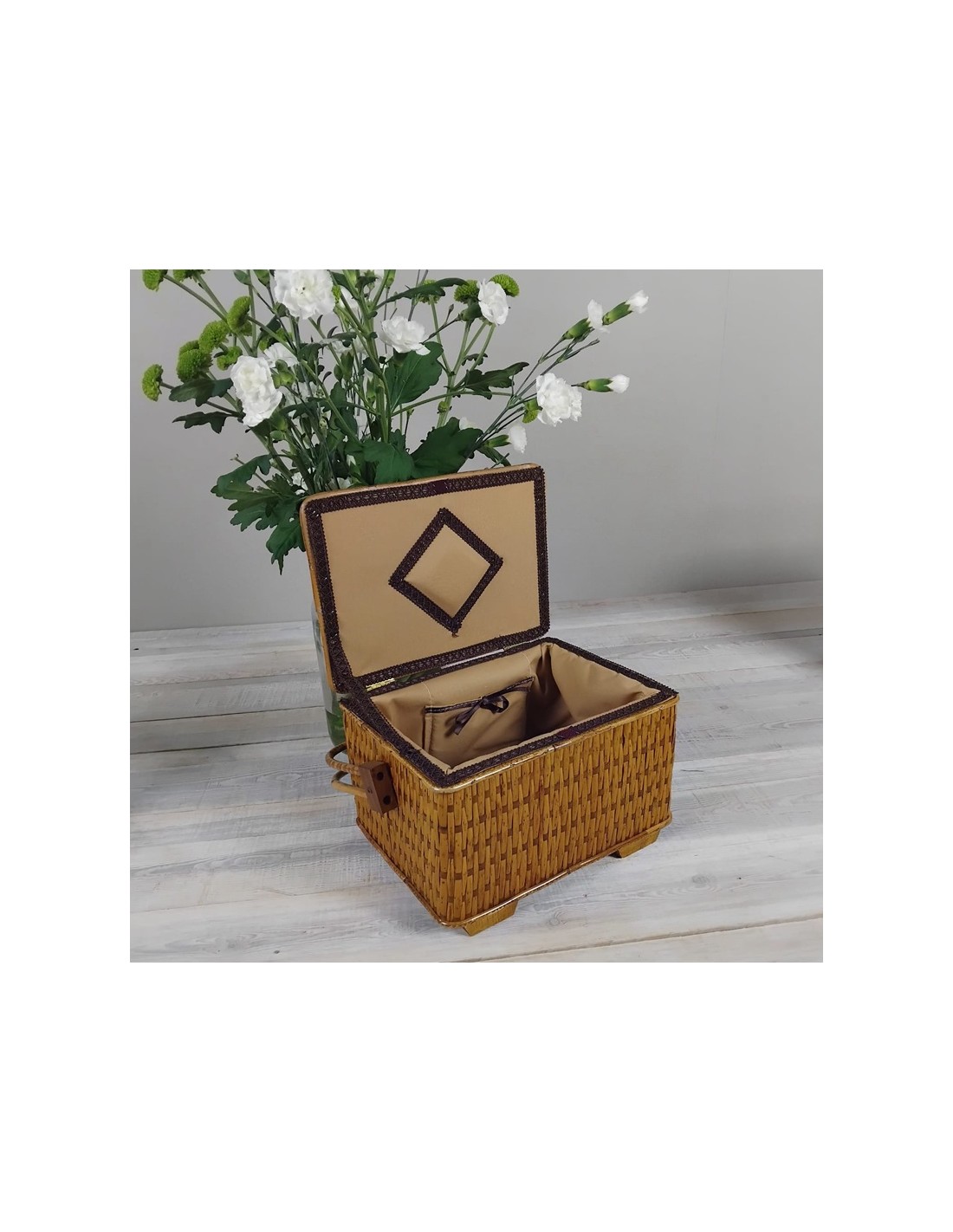 Cosidor gran de vímet amb coixinet i safata extraïble incorporada i folrat en tela estil vintage, costurer cistella artesanal i producció nacional.