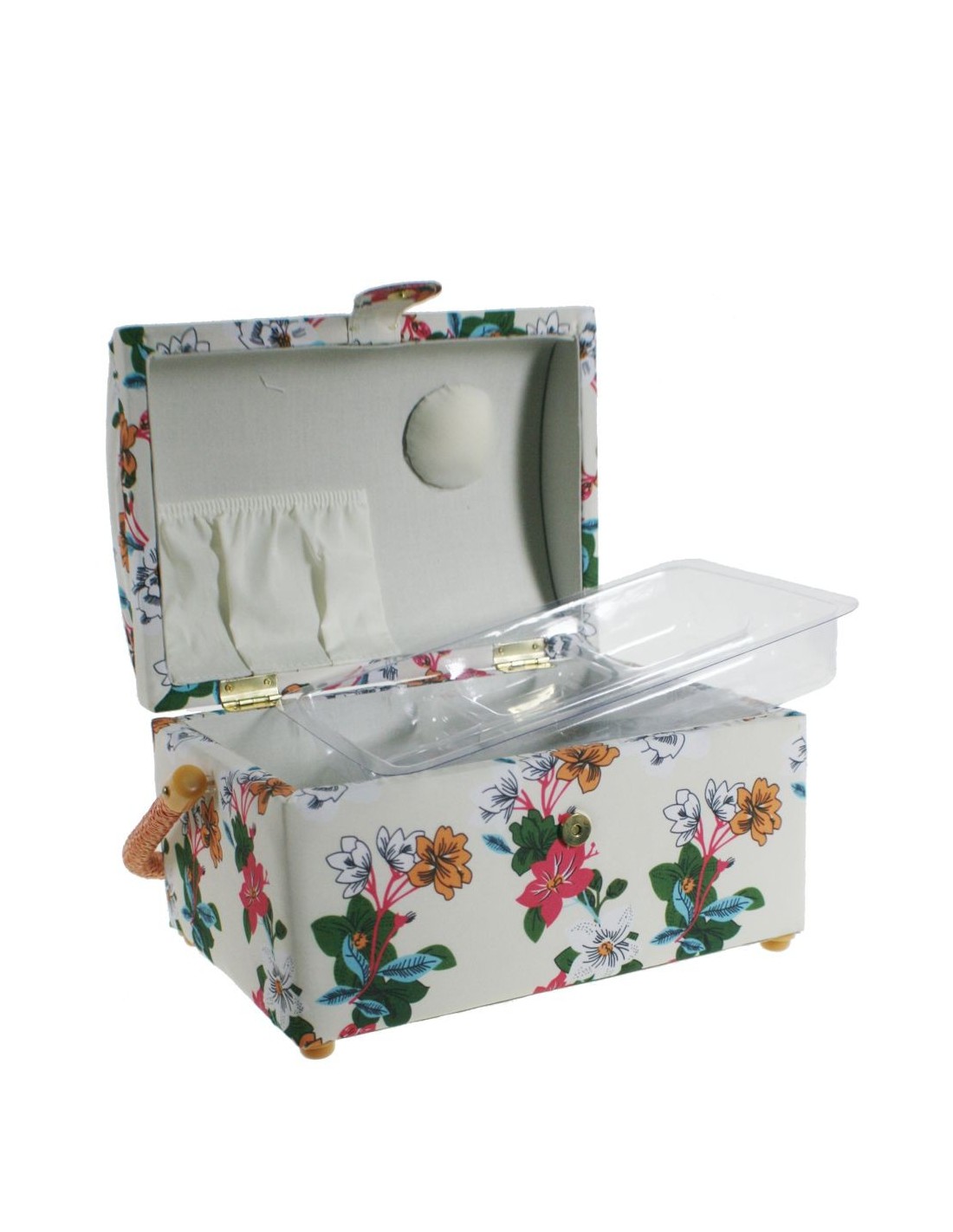 Costurer de tela amb disseny flors nansa i safata interior. Mides: 17x26x19 cm.