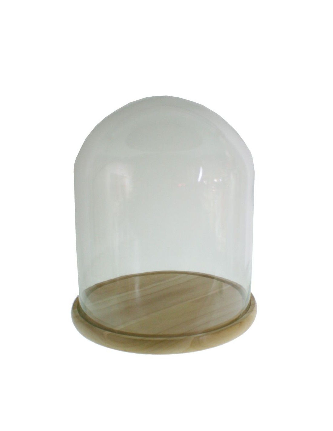 Cúpula campana de vidre amb base de fusta natural sense tractar, ideal per ressaltar i protegir figures, col·leccions i elements decoratius a casa teva, aparador o vitrina.
