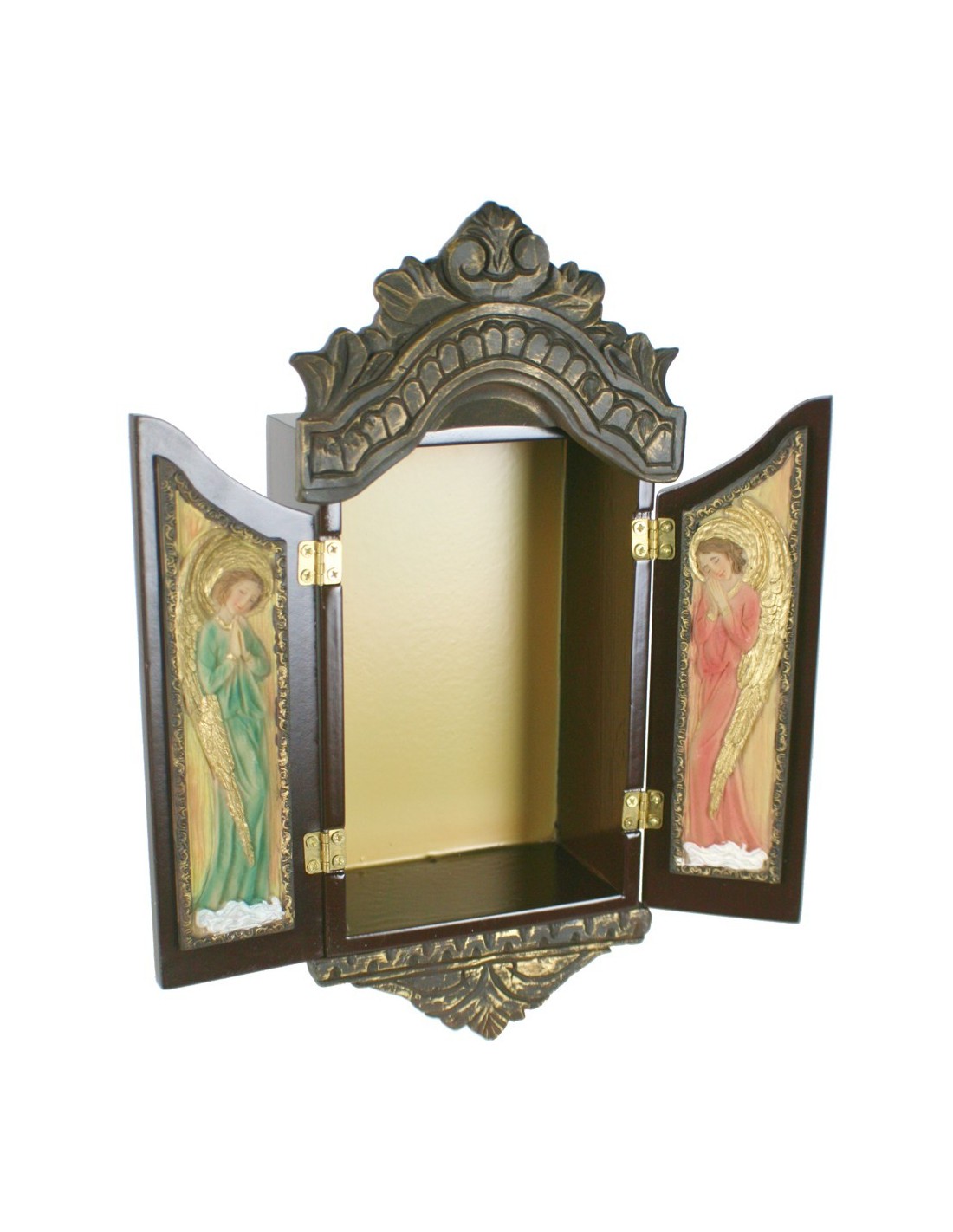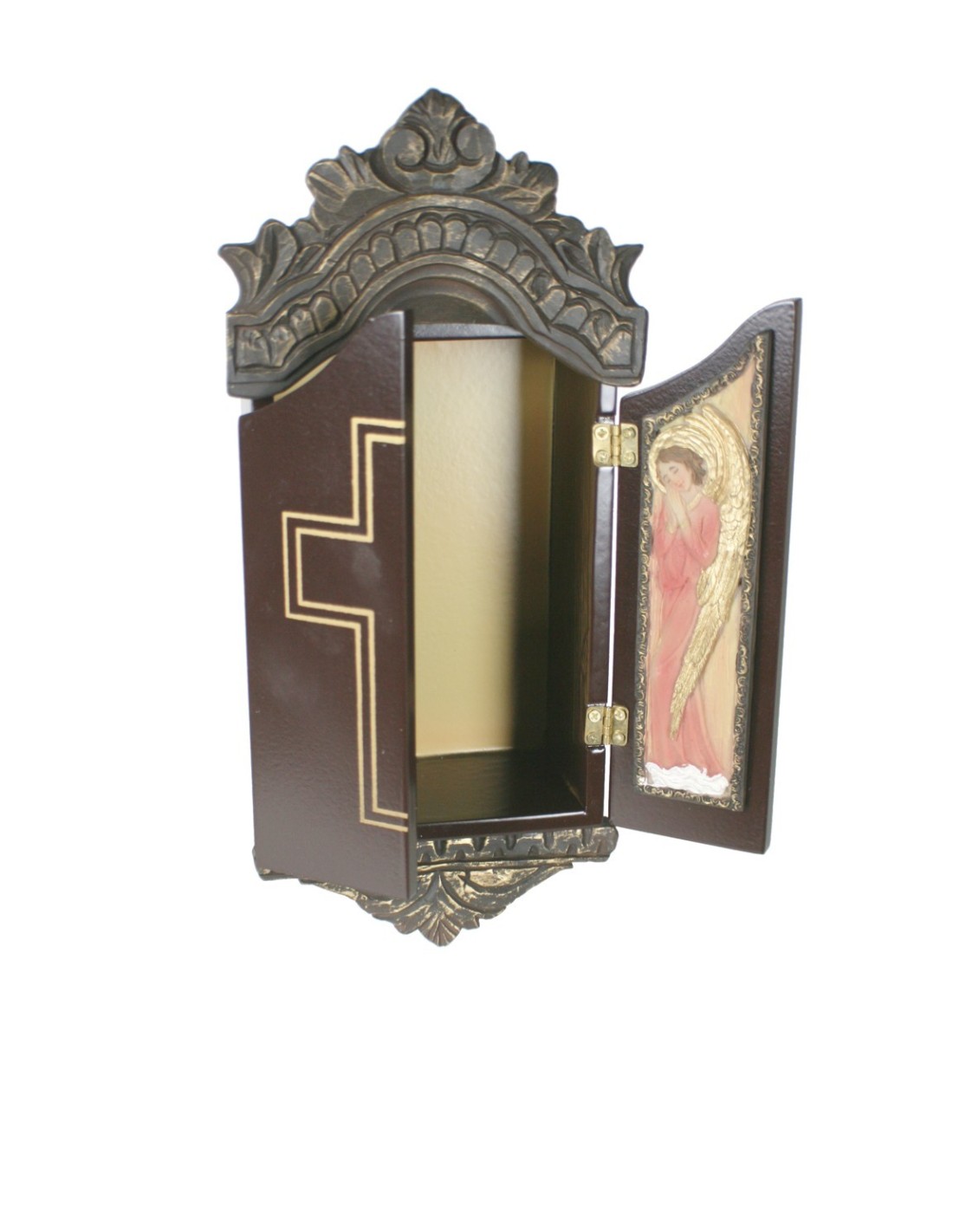 Armari capella fornícula de culte de fusta per penjar a la paret, bella capella amb portes i decoració per a figures de màxim de 13 cm. d'alçada. Una capella molt discreta i preciosa per regalar o tenir-la a casa teva.