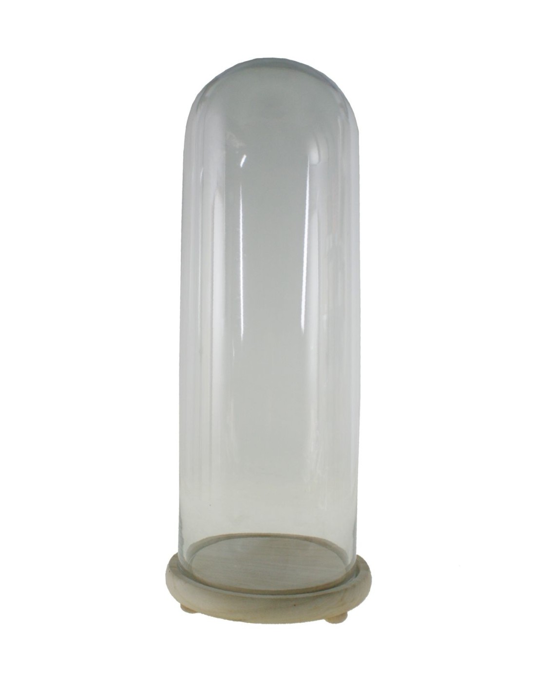 Cúpula campana de vidre alta amb base de fusta per exposició d'objectes decoratius. Mides: 60x22 cm.