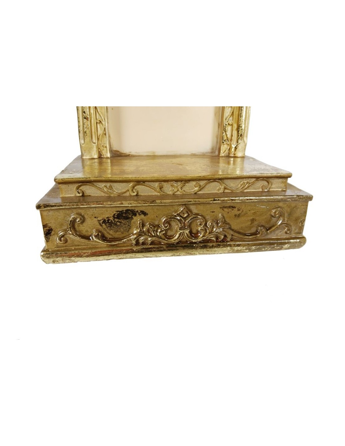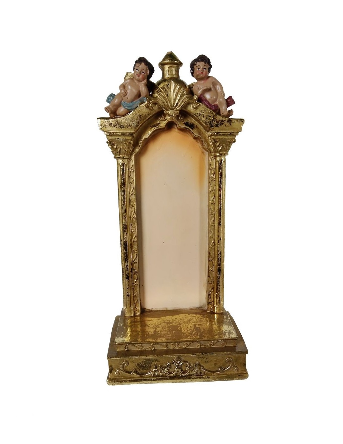 Elegant fornícula de resina daurada amb àngels a la cúpula, ideal per a l'exposició de figures de fins a 19 cm d'alçada. Un complement decoratiu perfecte per a espais de culte o per embellir qualsevol racó de casa teva.