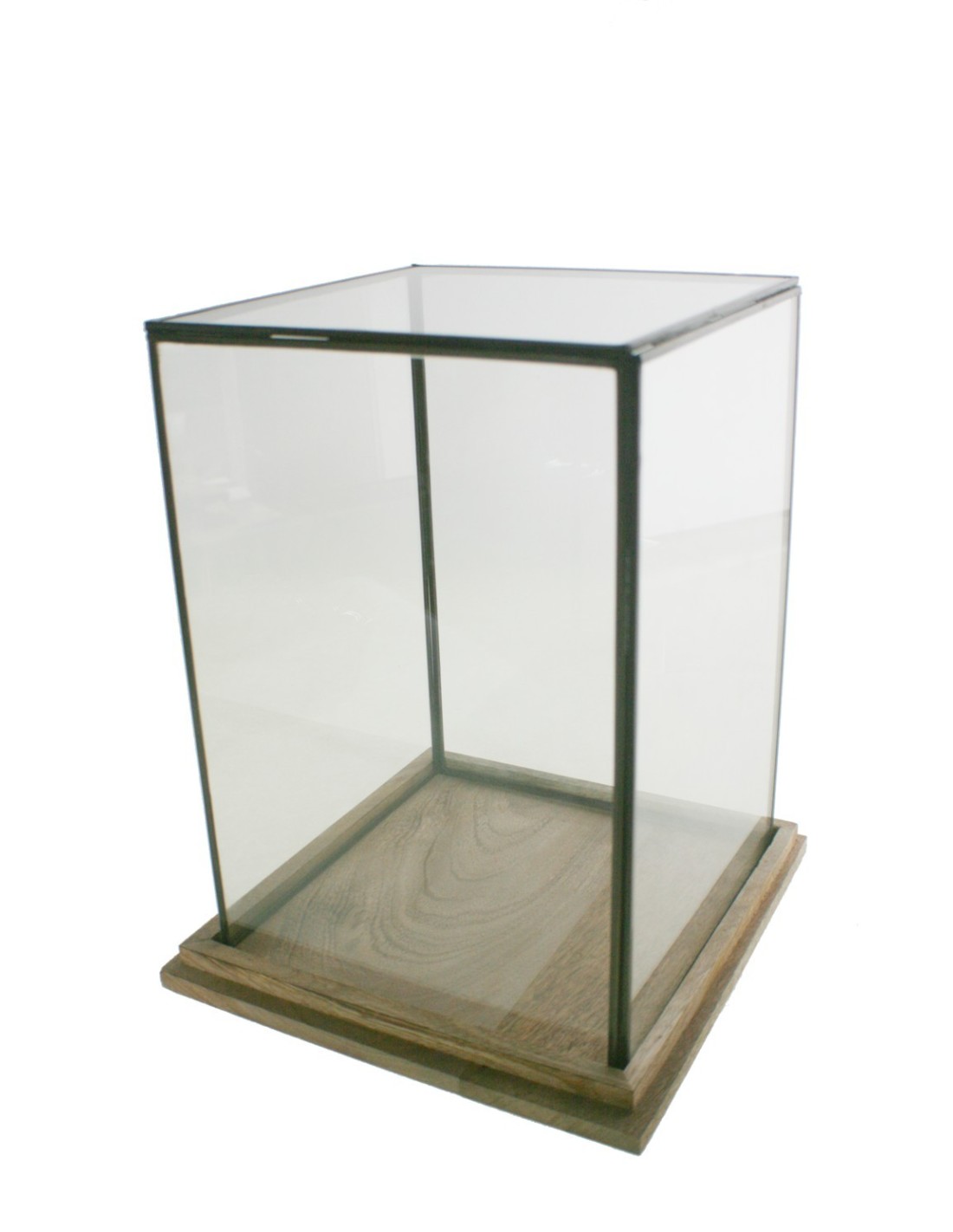 Urna de vidre amb perfilaria metàl·lica per a exposició de figura i altres objectes decoratius. Té una base de fusta massissa i és una alternativa a les cúpules rodones.