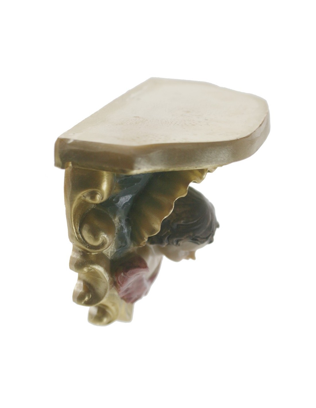 Pedestal petit de resina decorat amb cap d'àngel en petxina per penjar a paret. Un bonic detall per a exposició de figures. Aquesta mènsula és un article de bon acabat òptic.
