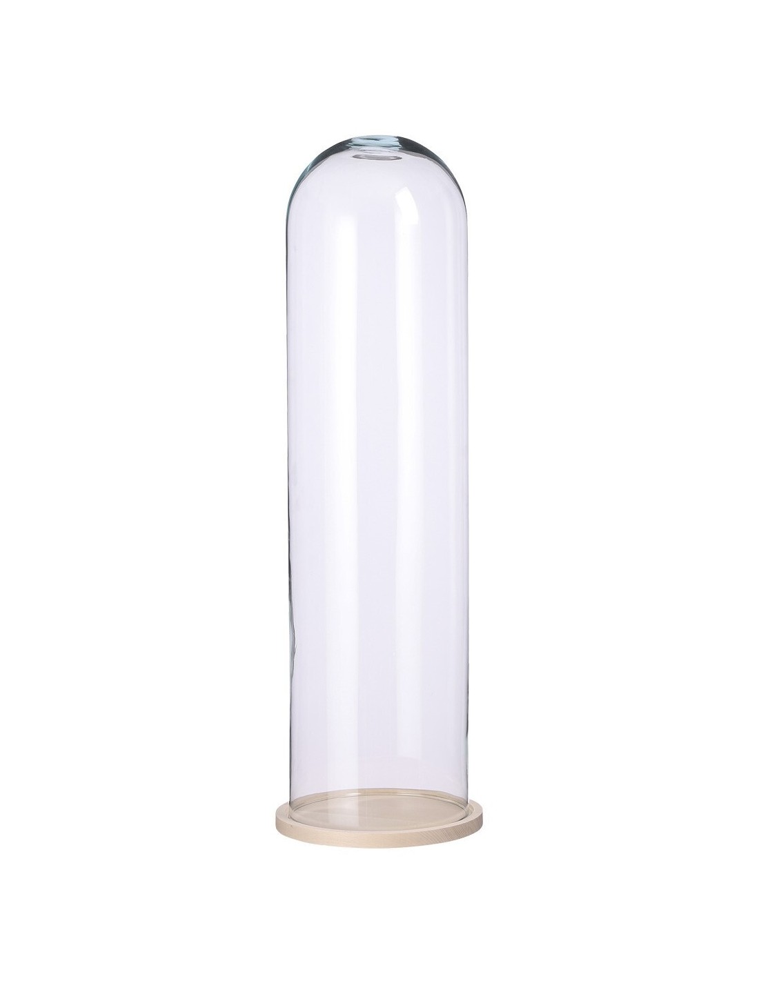Cúpula Campana de Vidre amb Base Fusta Color Natural per a Exposició d'Objectes Decoratius. Mides: 72xØ22 cm.