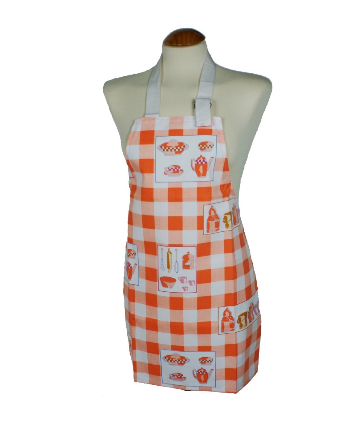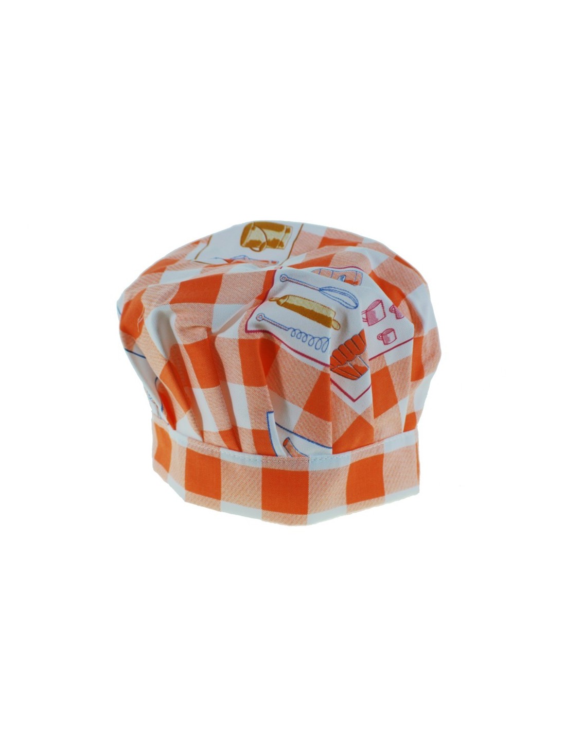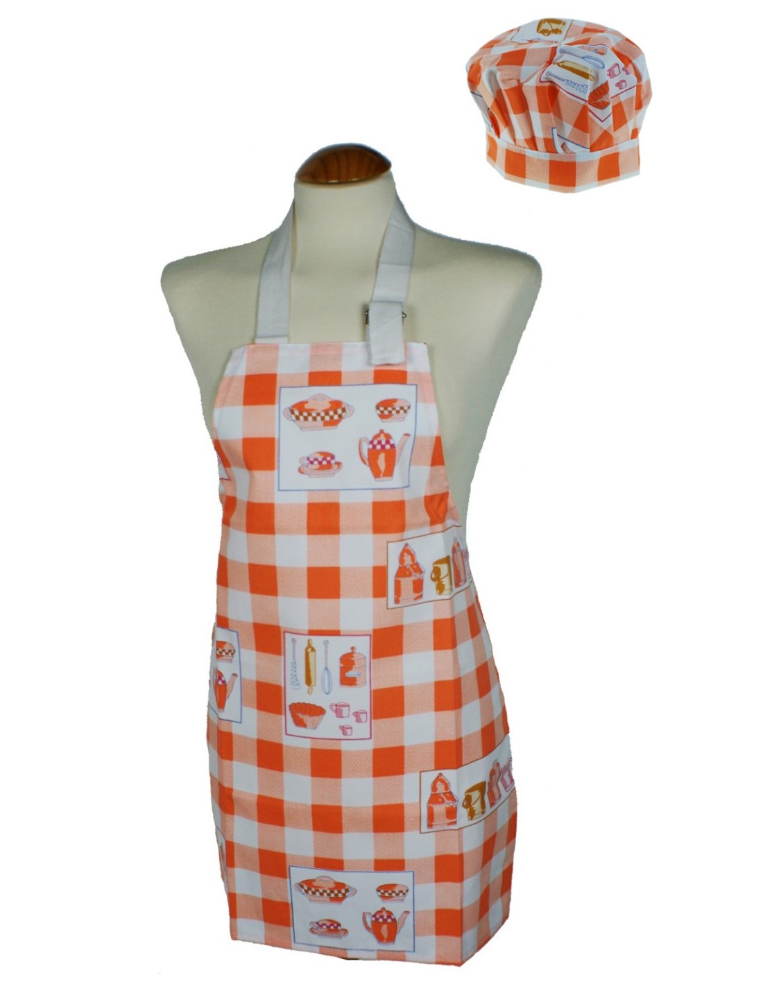 Davantal infantil cuina amb gorra i peto ajustable color taronja quadres. Mides totals: 65x50 cm.