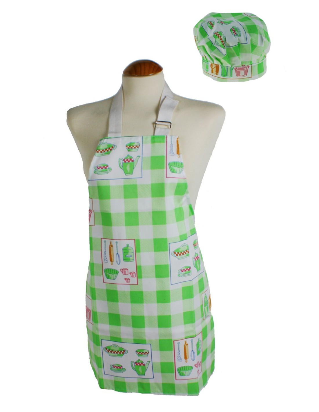Davantal infantil amb gorra disseny a quadres de color verd.