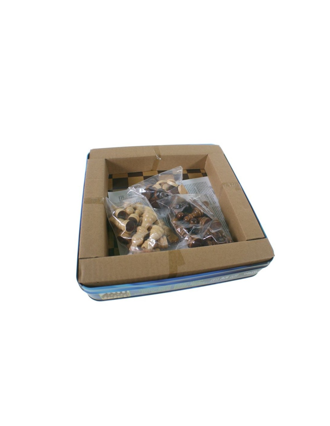 Joc d'escacs i dames de fusta a caixa de metall per a viatge joc de taula d'estratègia. Mides: 6x27x27 cm.