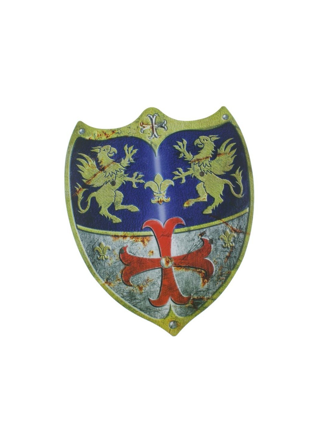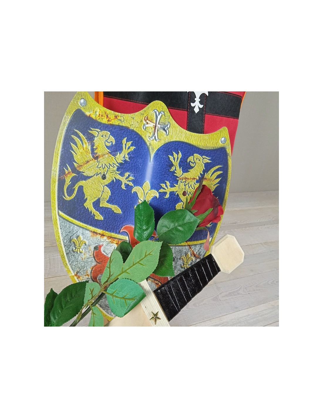 Aquest escut de fusta amb disseny medieval és el complement perfecte perquè els petits es converteixin en autèntics cavallers. Amb la seva forma triangular, creu vermella i nansa de subjecció, convida a recrear aventures de castells, batalles i llegendes de l'Edat Mitjana.