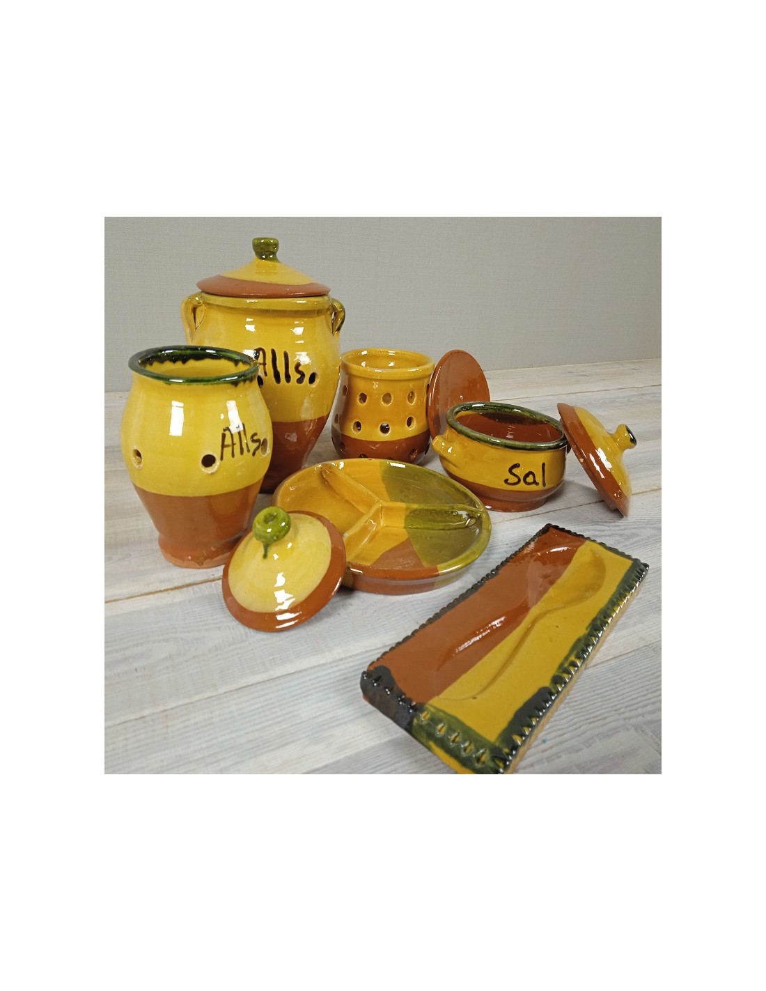 Pot per alls de color tradicional de terrissa realitzat artesanalment. És un preciós regal i molt decoratiu per a la teva cuina o rebost.