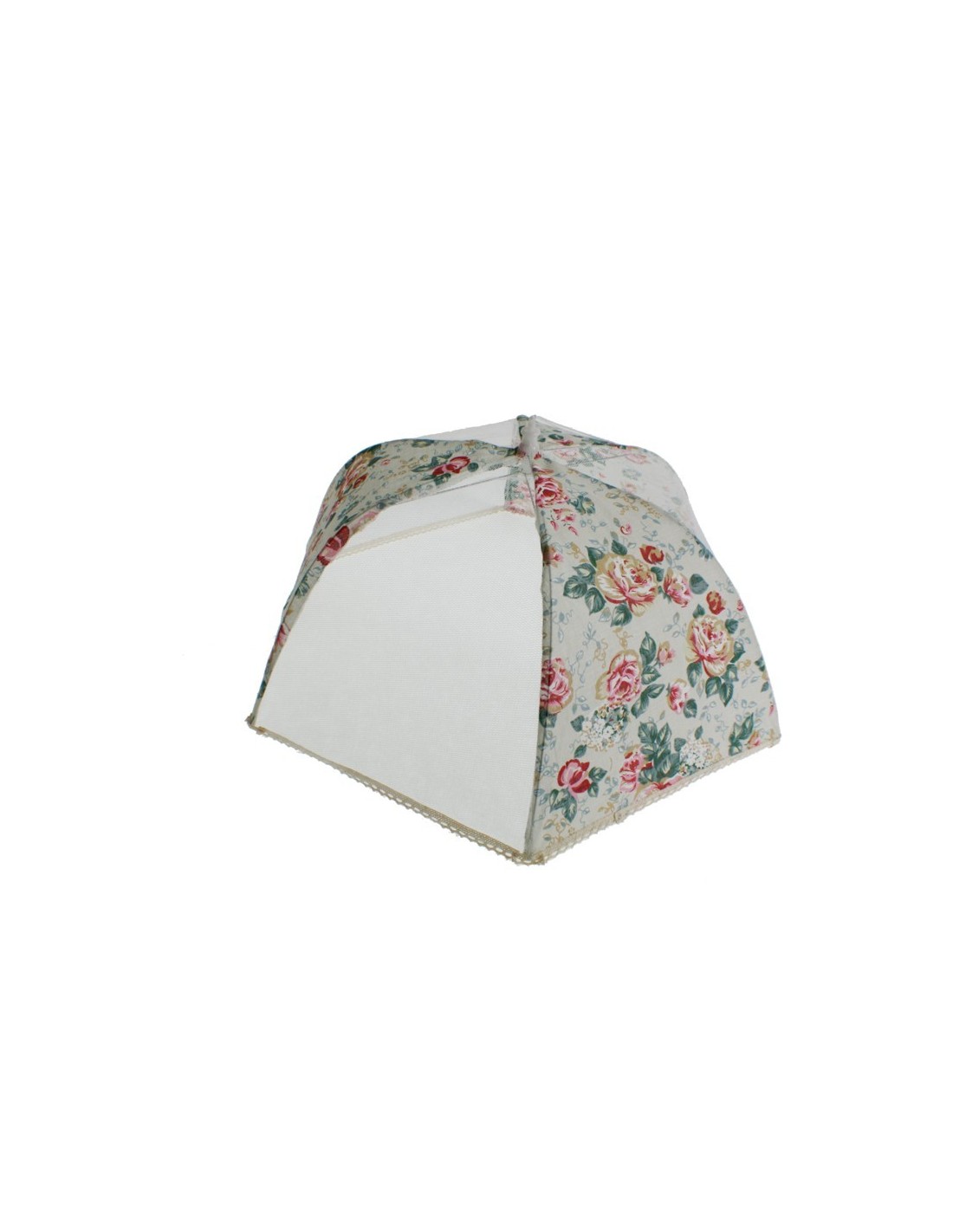 Protectora per cobrir aliments en forma de paraigües desplegable amb malla transparent i tela en flors, molt decoratiu per a la taula de jardí.