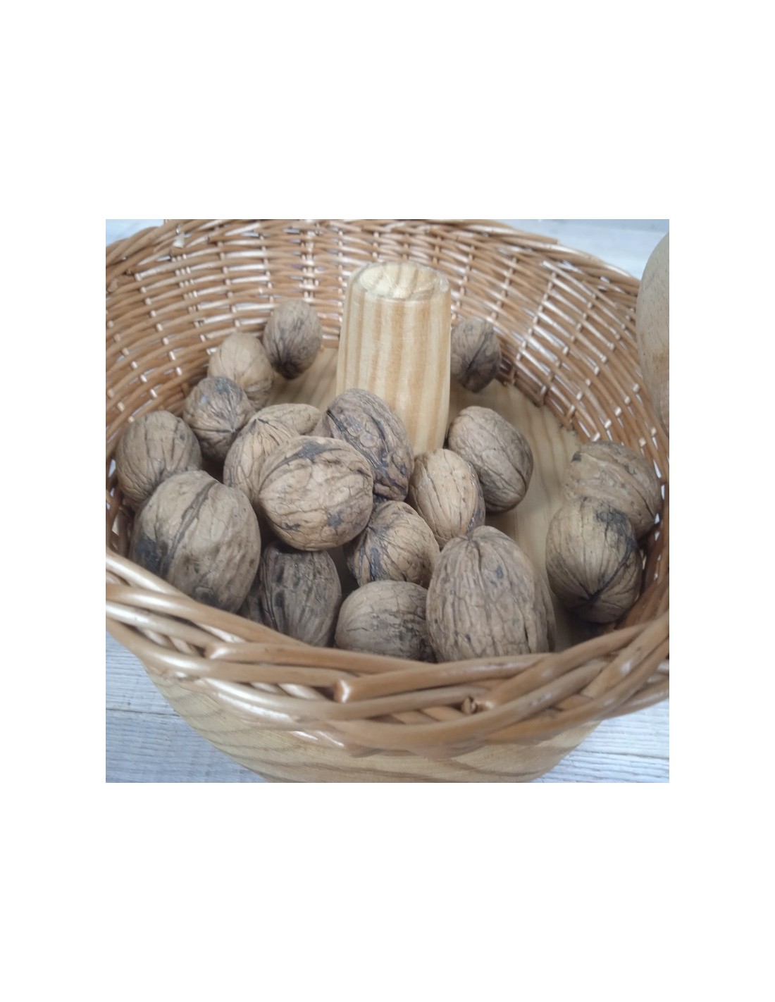 Sòlida cistella de vímet amb sola de fusta especialment indicada per trencanous. Es subministra amb mall i sense garantia de picar-te els dits.