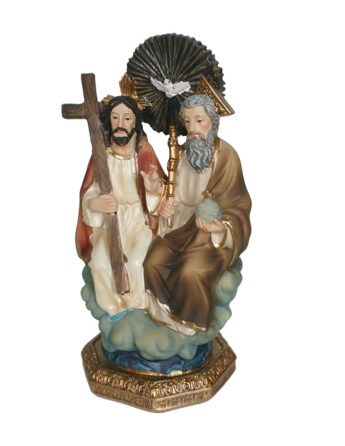 L'escultura de la Santíssima Trinitat està elaborada meticulosament en resina, amb detalls pintats a mà que capturen l'essència de la doctrina cristiana. Cada figura representa el Pare, el Fill i l'Esperit Sant, destacant-ne la singularitat i la unitat.