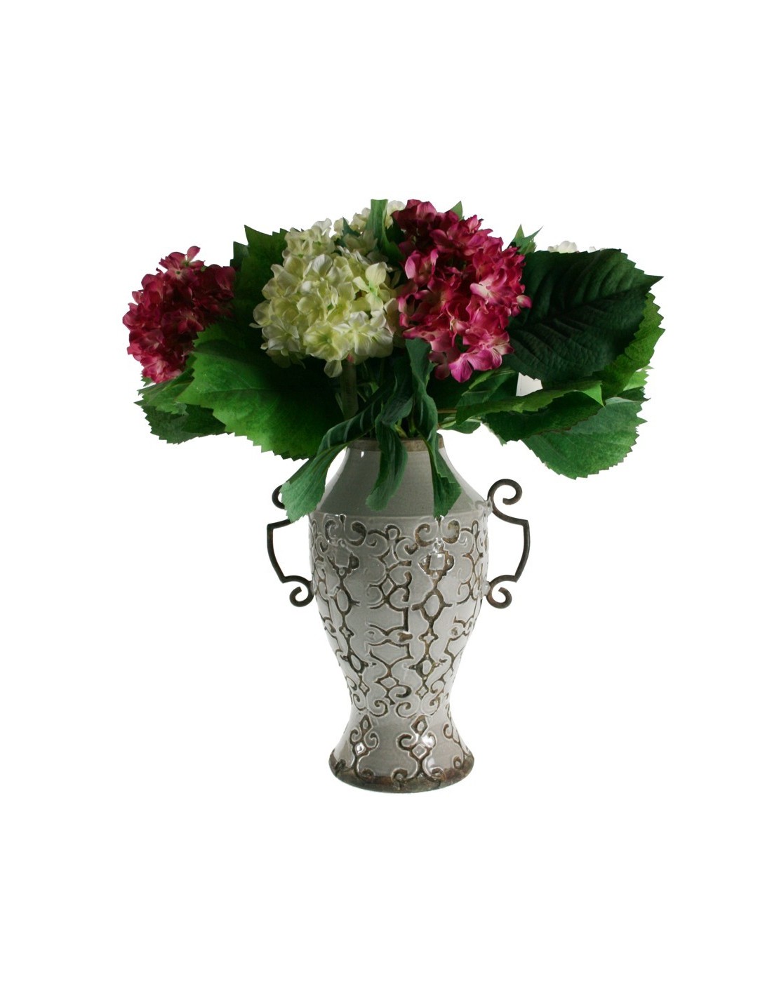 Florer de Ceràmica gravada de Color Gris i amb Nanses de Metall Estil Rústic Decoració Llar. Mides: 33x24 cm.