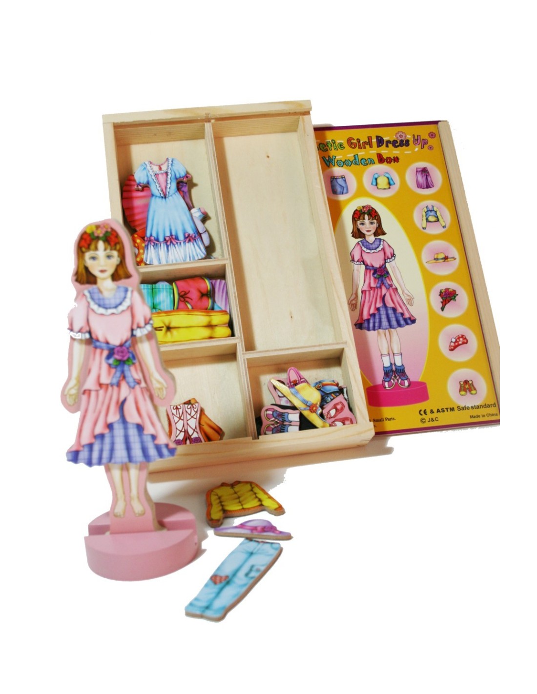 Aquesta nina es col·loca sobre una base de fusta i es vesteix amb diferents peces imantades, permetent als nens barrejar i combinar per crear múltiples looks.