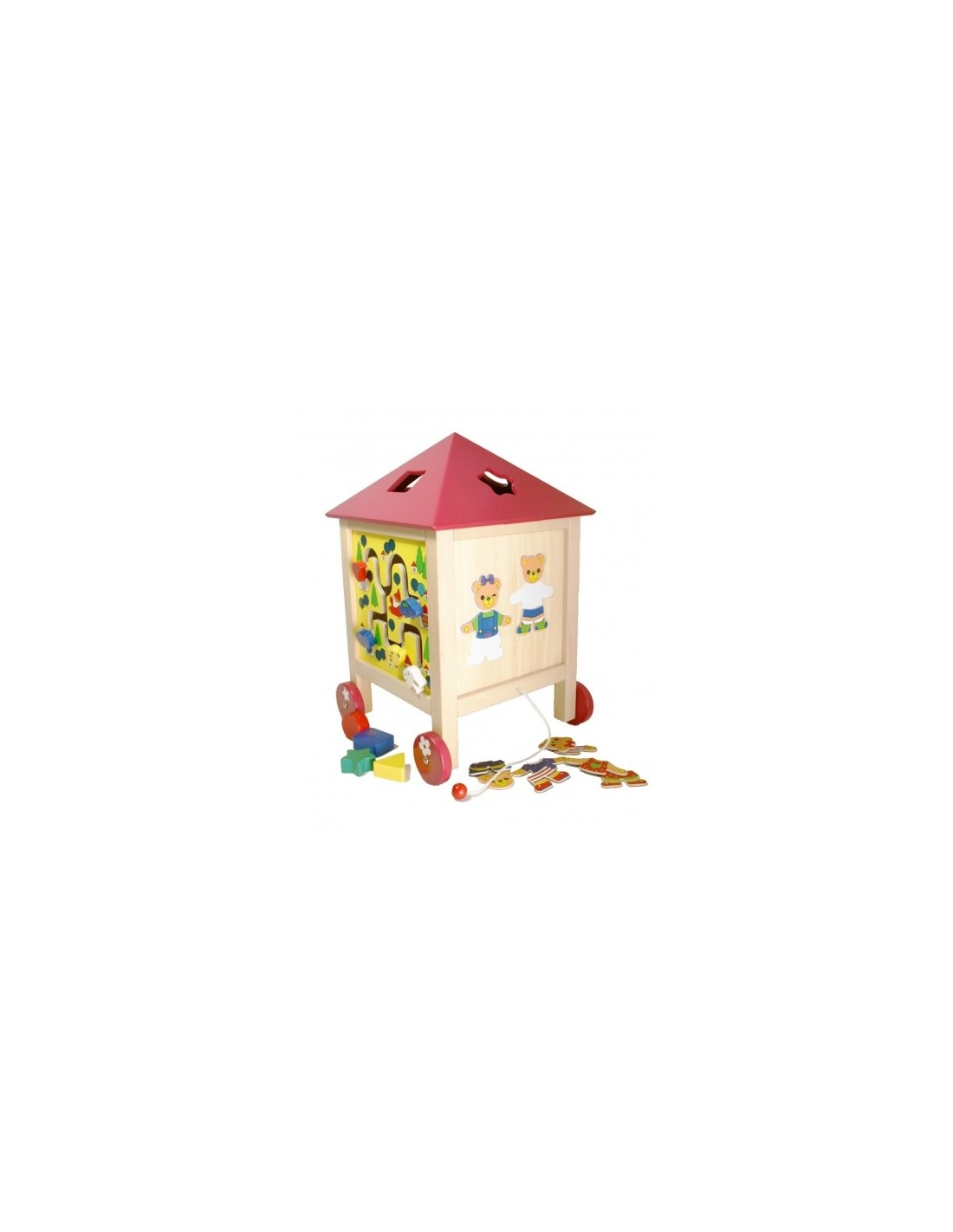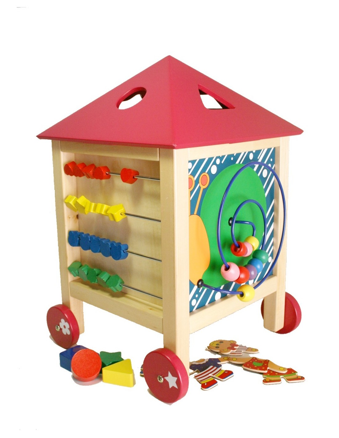 Bagul de fusta amb rodes, sostre extraïble i accessoris per apilar, encaixar, enfilar i calcular. Un complet centre de joc que estimula coordinació, destresa i aprenentatge.