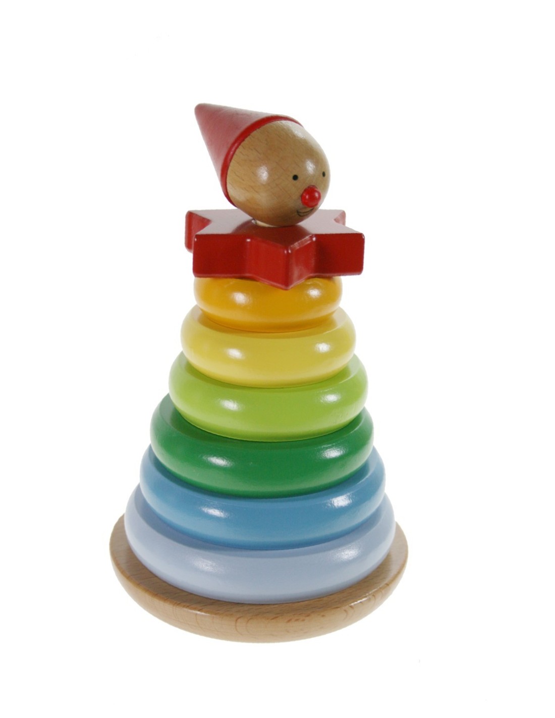 Aquest colorit puzle de 7 peces de fusta estimula la motricitat i l'aprenentatge a través d'apilar, encaixar i ordenar anells. Fabricat amb pintura no tòxica, ideal per als més petits.