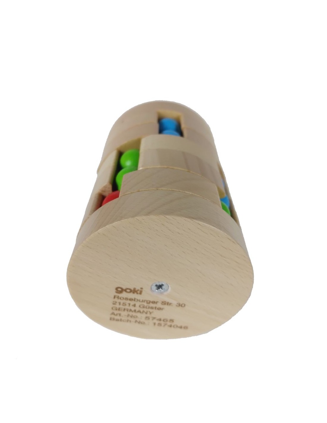 El cilindre de fusta és un joc d'habilitat clàssic que combina diversió i aprenentatge. El disseny en forma de torre permet moure els anells per alinear les boles de colors vermell, verd, blau i groc. Cada gir suposa un repte diferent, ajudant a millorar la concentració i la coordinació ull-mà.