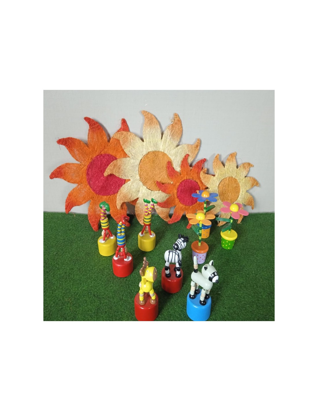 La flor taronja de fusta articulada és una joguina senzilla, colorida i plena d'encant. Només pressionant el ressort situat a la base, la flor cobra vida realitzant moviments divertits que desperten la curiositat dels petits.