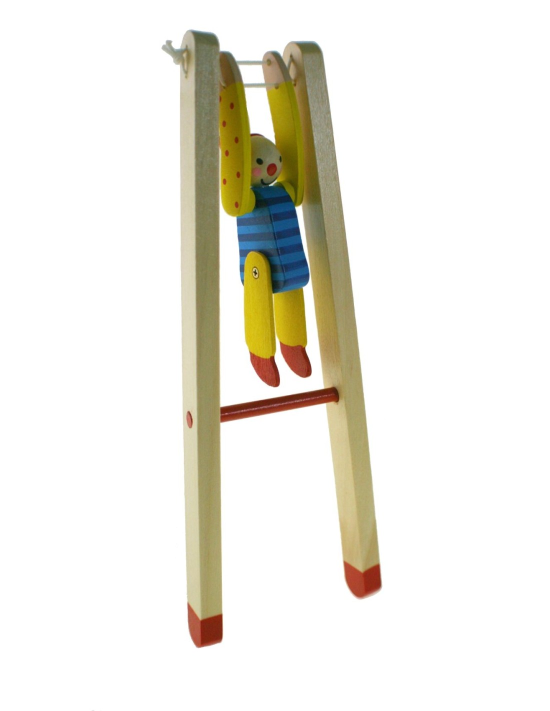 Pallasso equilibrista a la barra, una joguina de fusta tradicional que desenvolupa l'habilitat manual dels nens. Amb el seu disseny colorit i divertit, és perfecte per entretenir i fomentar la coordinació.