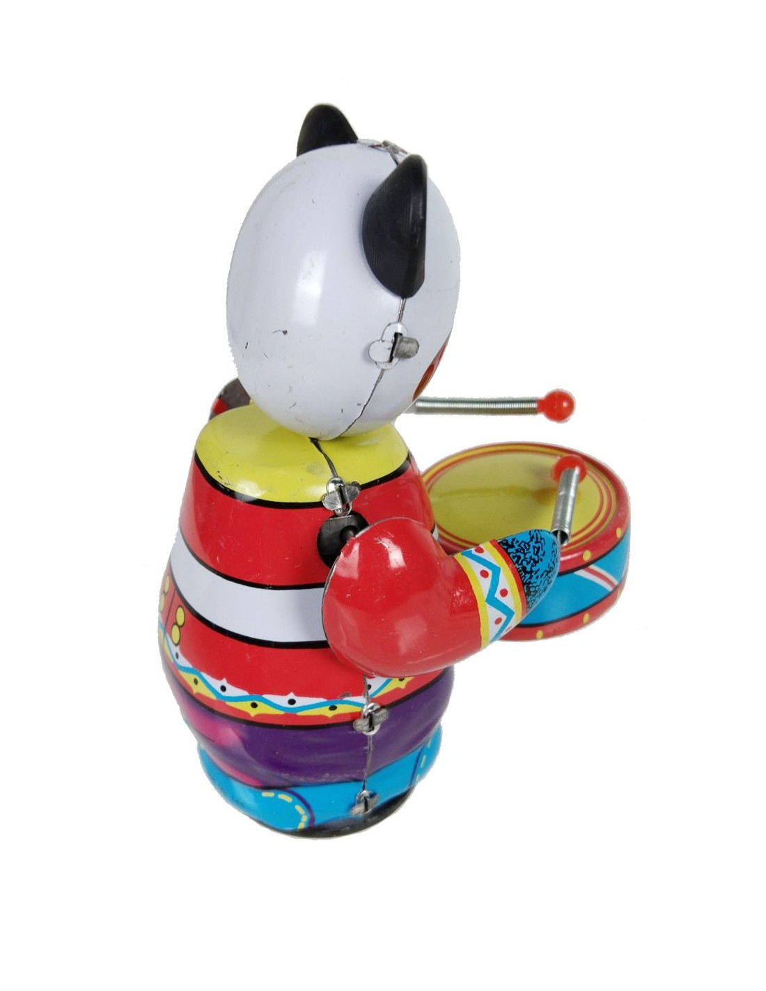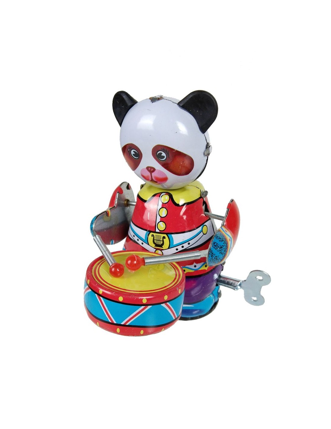 Fabricat en metall durador, aquest panda tamboriner és resistent i té un acabat pintat a mà en colors vius. El disseny retro transporta a l'època daurada de les joguines de corda, convertint-lo en una peça de col·lecció o un regal perfecte.