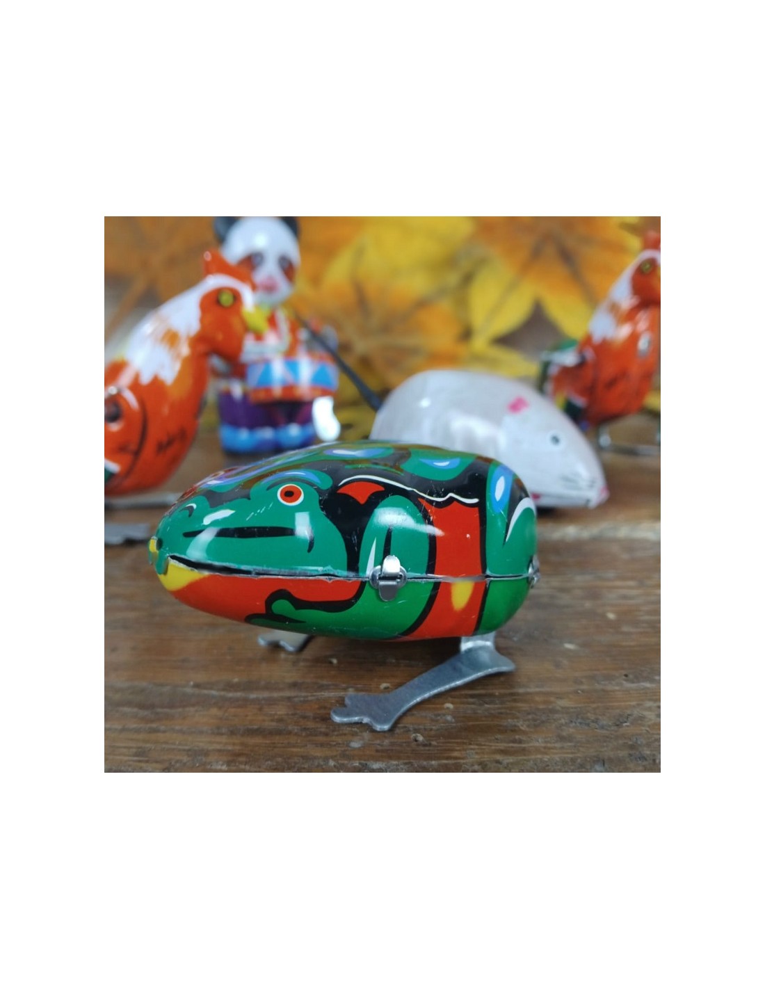 Fabricat en metall durador, aquest gall saltador és resistent i té un acabat pintat a mà en colors vius. El disseny retro transporta a l'època daurada de les joguines de corda, convertint-lo en una peça de col·lecció o un regal perfecte.